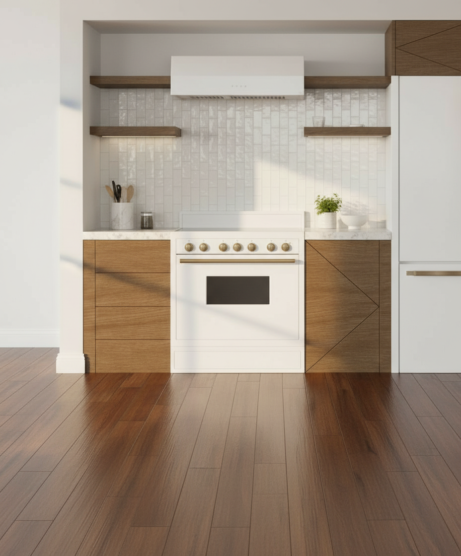 cinematic architectural visualization of a mid century modern home resting quietly among mature oak trees on expansive land strong horizontal lines flat roof planes generous glazing and sheltered outdoor terraces materials include muted natural wood cladding and warm brick distributed according to the architectural model subtle contrast between wood warmth and textured masonry golden hour to early dusk setting with soft architectural lighting under overhangs and inside the home creating a gentle layered glow interior lights warm and intimate exterior landscape lighting subtle and minimal long shadows from oak trees slightly hazy atmosphere soft breeze in foliage tranquil and timeless mood photorealistic high resolution architectural digest style natural depth of field refined and understated elegance