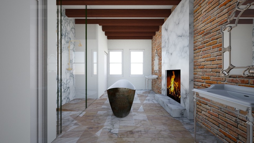 bathroom design 12 0 width by 15 0 length exposed wood beam celing with white drywall in between beams track lights on drywall left to right in the room left no show door 3 x8 shower glass wall see though to black bizza tile shower with white penny tile floor another door 3 x8 center two large 3 x 5 windows with large trim moldings center of the room is a floating soaking tub right pedistal marble sink with large ornate mirror hanging over with pendants fireplace between sinks another pedistal sink with an ornate mirror hanging above