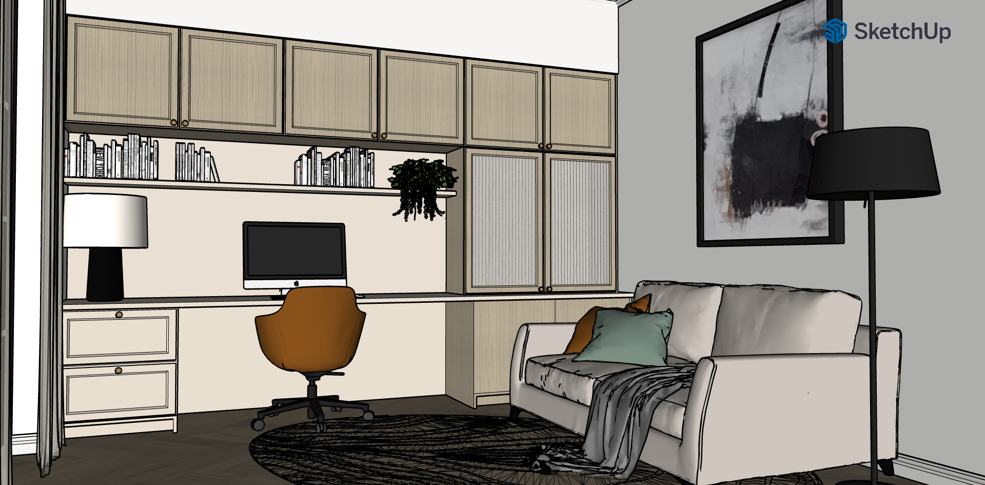 create a photorealistic rendering of a modern multifunctional home office lounge space important do not change or modify anything in the model all furniture d cor and layout must remain exactly as in the image only materials lighting and rendering quality should be enhanced for realism lighting soft natural daylight entering from the left large window with sheer curtains daylight around 10 00 am complementary warm ambient lighting for cozy atmosphere slight glow on the table lamp and floor lamp 3000k materials textures floor whitewashed oak in herringbone pattern matte finish cabinetry same whitewashed oak tone as the floor but in linear wood grain vertical horizontal matte no herringbone pattern display cabinet vitrine framed in the same oak with ribbed glass doors vertical ribbed pattern semi transparent objects inside partially blurred subtle reflections and light play desk light neutral beige with smooth matte surface sofa soft off white linen fabric with visible weave throw cotton light grey slightly wrinkled for realism cushions one terracotta velvet one sage green linen chair cognac leather with subtle sheen and black metal legs rug round dark beige yet light in tone woven texture neutral and warm curtains soft fabric warm grey slightly translucent styling details books with varied covers and spines for realism potted hanging plant with cascading greenery trailing leaves abstract black and white artwork above sofa with light texture floor lamp matte black with smooth cylindrical shade computer screen slightly reflective turned off black ribbed glass vitrine softly distorts interior objects catching light with vertical highlights camera composition eye level perspective wide angle lens 24 28mm depth of field slight focus on sofa and desk background subtly softened mood atmosphere calm modern warm and inviting designed for productivity and comfort