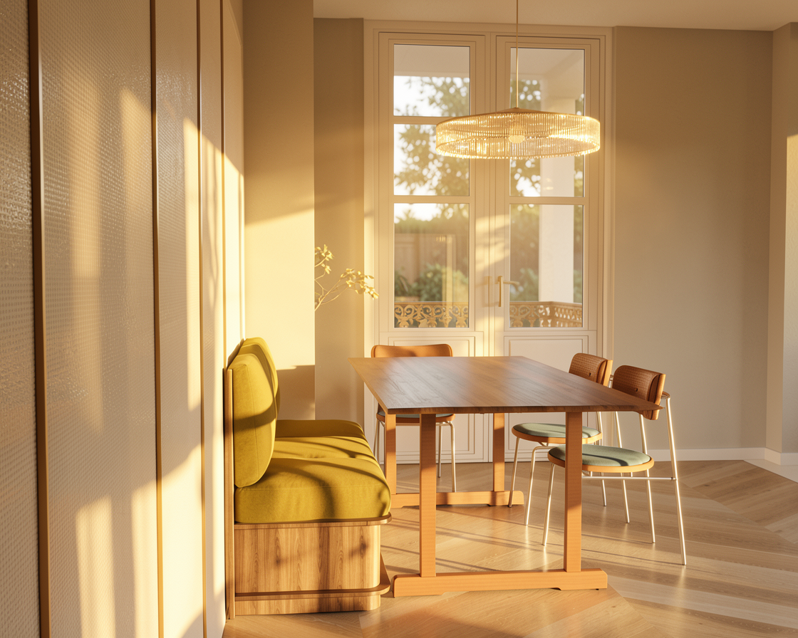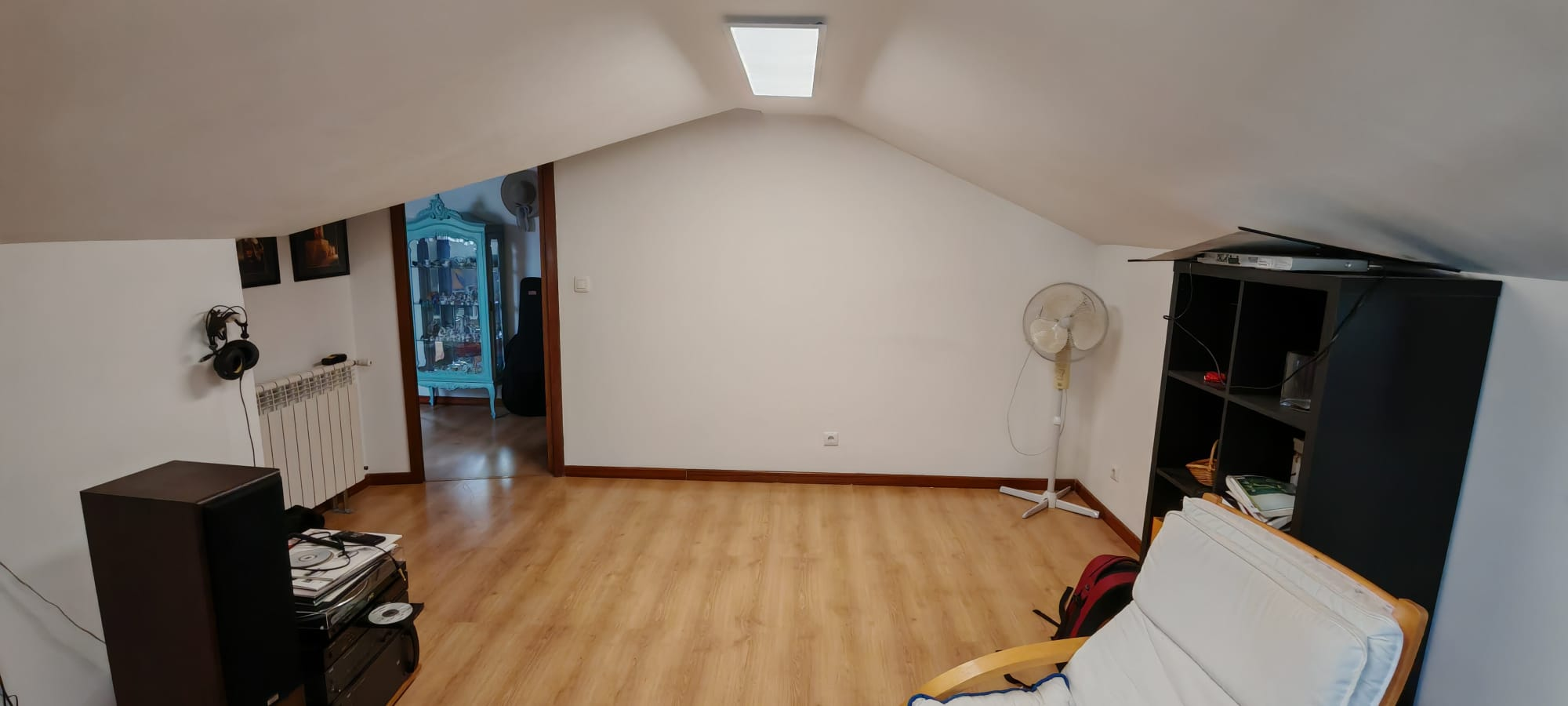 transform this attic room into an unfinished podcast studio keep the original room proportions sloped ceiling wooden floor and central window remove the existing furniture and replace it with a centered rectangular table suitable for podcast recording with four comfortable modern chairs around it on the table place podcast microphones on articulated arms headphones and minimal audio equipment but make the setup look partially incomplete as if still in progress add simple acoustic panels on the walls some decorative elements related to podcasting such as framed posters small plants led ambient lighting and soft studio lights keep a clean but cozy atmosphere modern and functional with neutral colors warm lighting and a realistic professional podcast studio aesthetic