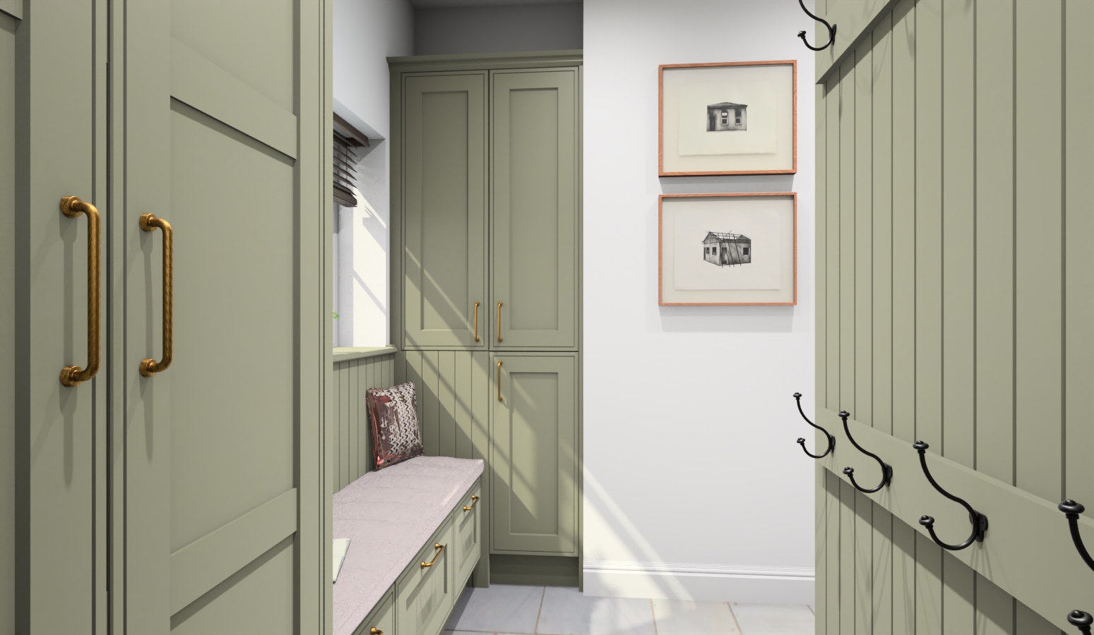 make this image 8k hyper realistic as if it were taken via an iphone camera artificial lighting should beautifully blend with natural lighting showing the subtle grain effect on the painted ash kitchen door keep dimensions the same and in a landscape format keep dimensions the same midday sunlight coming through large windows casting realistic shadows and reflections shot with a dslr camera 35mm lens shallow depth of field ultra high resolution photorealistic ray tracing global illumination highly detailed textures realistic lighting cinematic composition