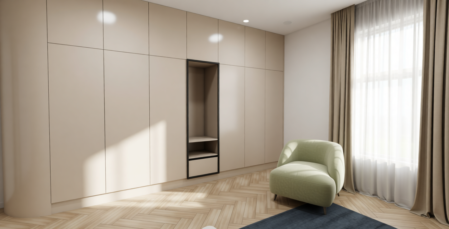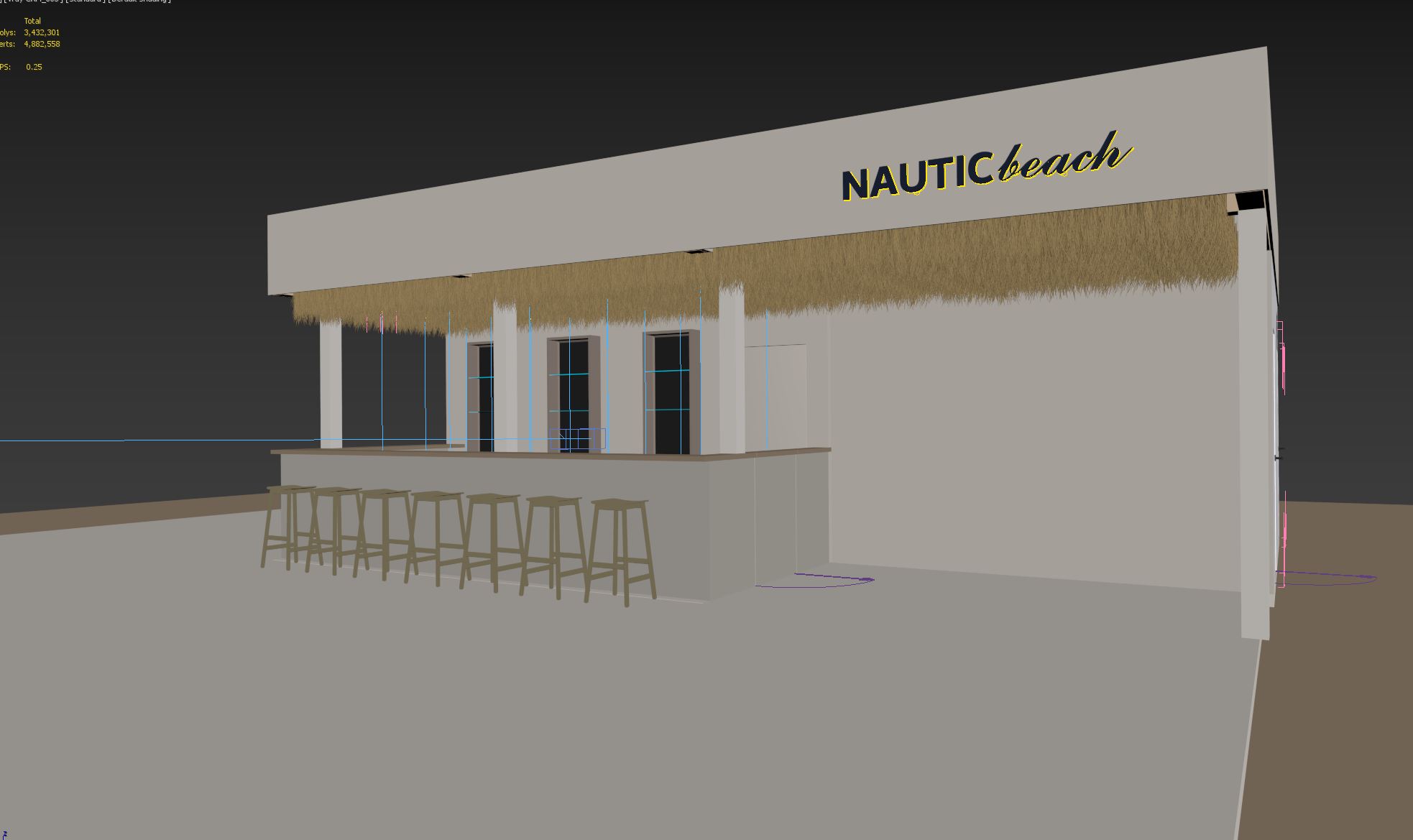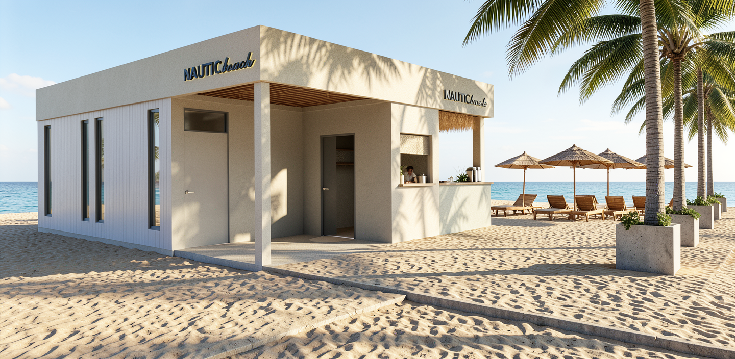 render this beach building which is a beach bar add sand a beautiful beach promenade in the background the back of the bar has mirrors reflecting the sea add tall palm trees in concrete planters add realism natural sunlight maintain all shapes