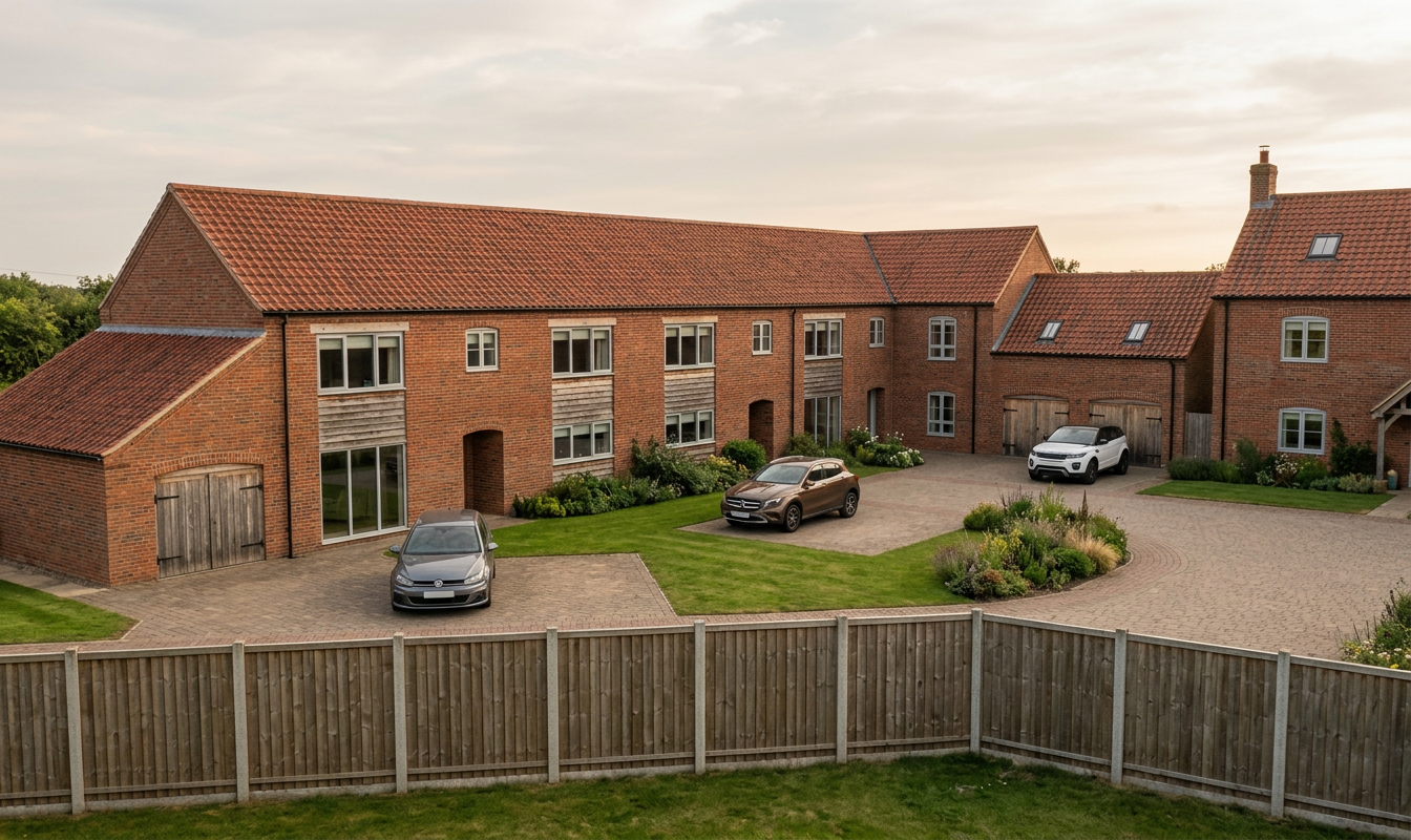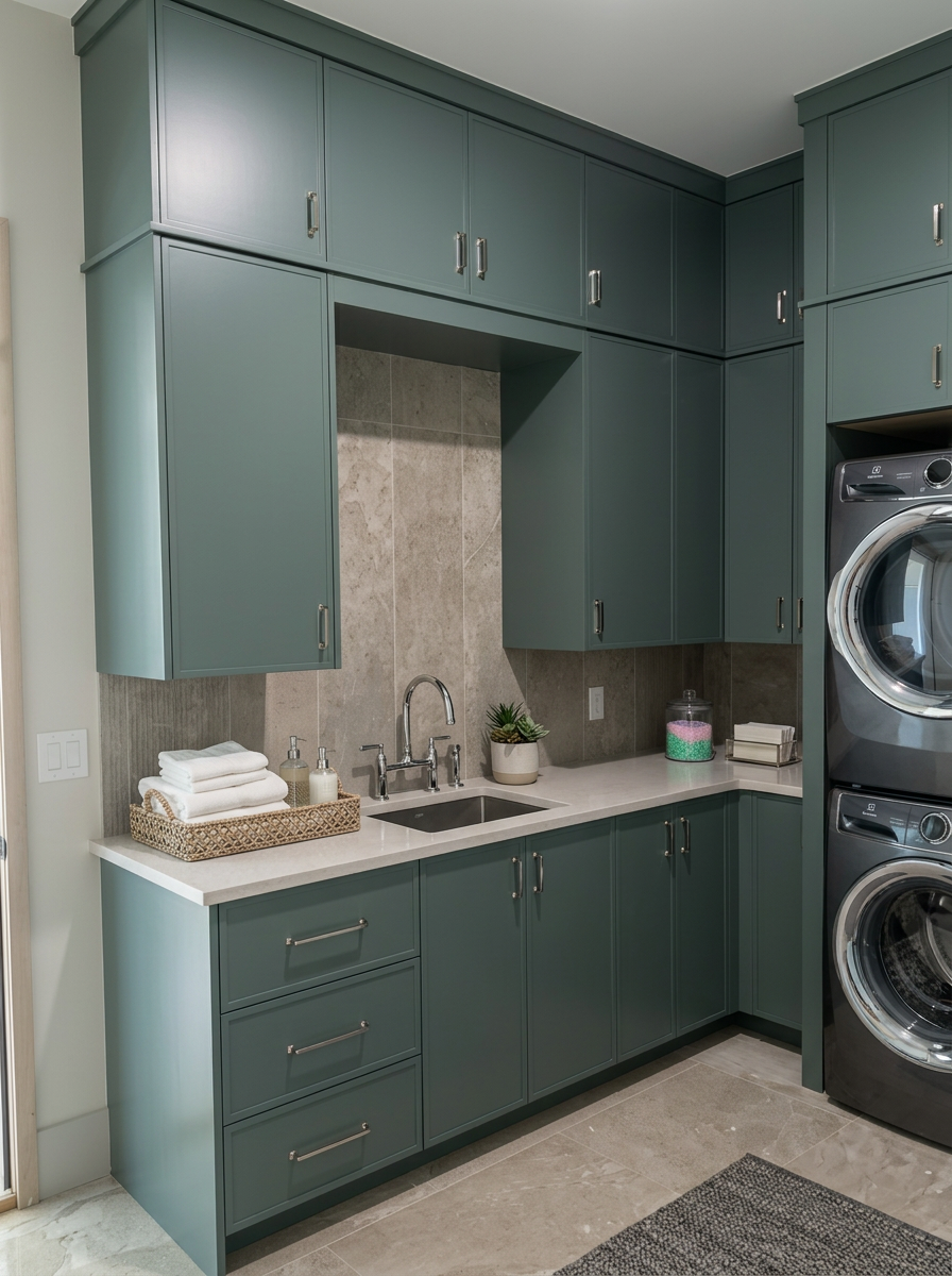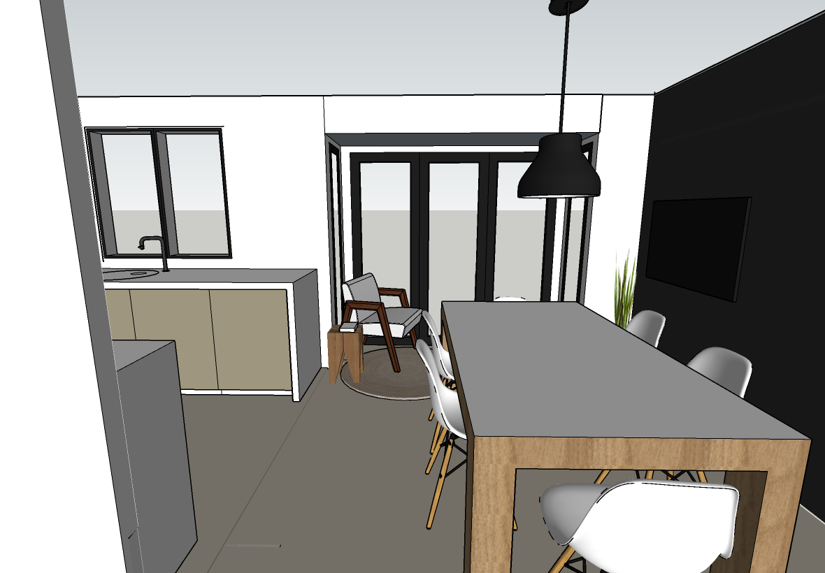 a modern kitchen and dining area with sleek minimalist design the countertops and sides are a white complementing dark muted khaki green cabinetry the floor is a matt muted solid beige tile the dining table is made of light oak and has a gloss white top and the eames chairs are a striking white with wooden legs large windows let in soft natural light casting gentle shadows the atmosphere is warm and inviting with a touch of greenery adding life the right wall is a dark charcoal and has a tv the remaining walls are white enhancing the contemporary feel a black pendant light hangs over the dining table creating a cozy focal point in the evening a mid century modern armchair with white cushions and a wood stool sits on a small round jute rug