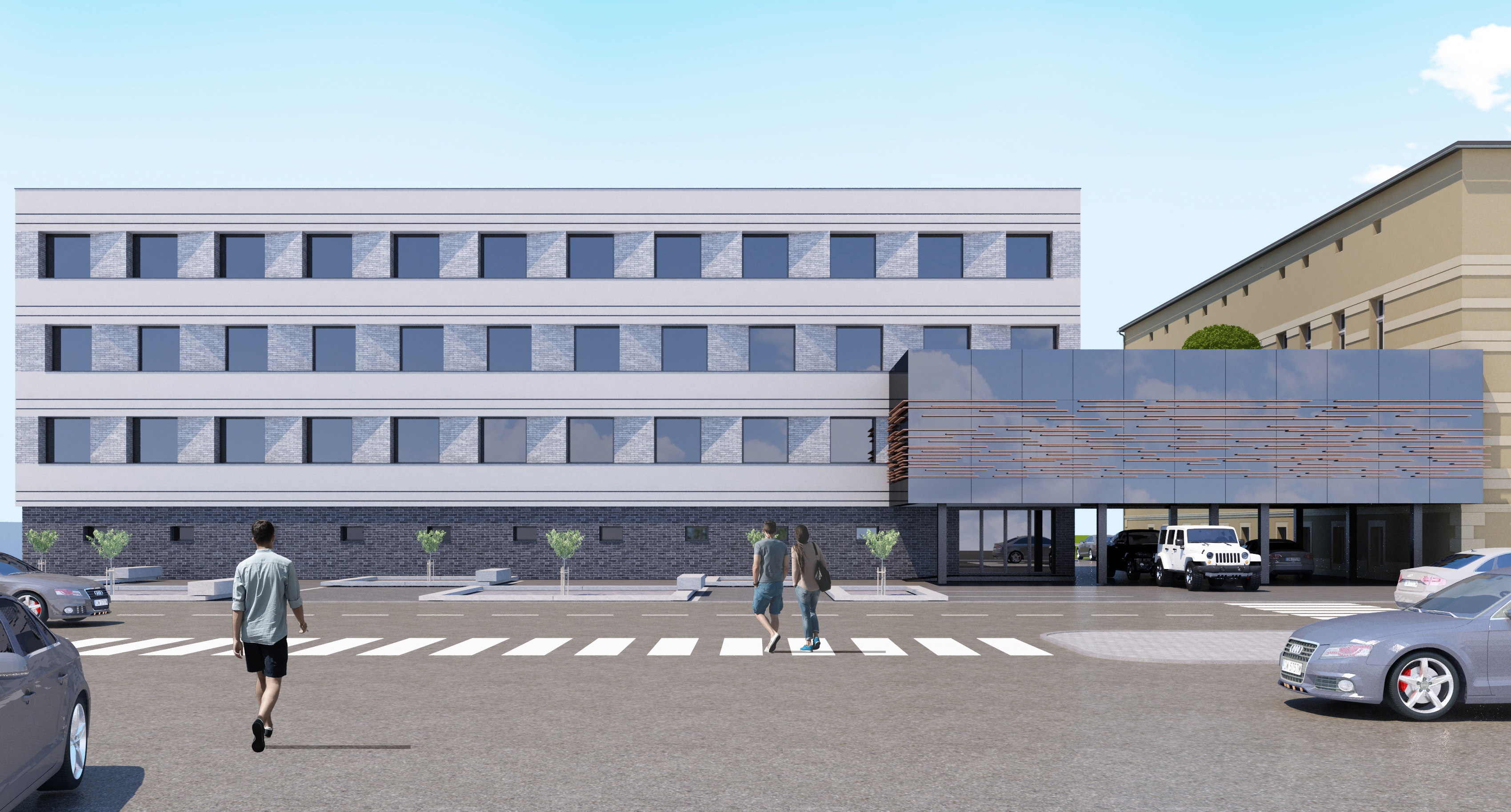 render a photorealistic 3d perspective of this building referencing the current style of materials just improve them keep the same model geometry create lush vegetation that looks natural do not change the view just improve the current materials and make the landscape nicer vegetation detailed textures reflections in the glass and a vivid clear sky with a light atmospheric depth