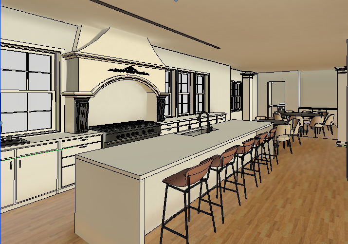 elegant realistic image with white painted paneled walls and columns add interior lighting dusk sky outside add decorative dishes add art on rear wall soften the sky make black areas next to stove white add soft lighting over stove make are more colorful only soften the stove hood lighting change the barstools to more lush