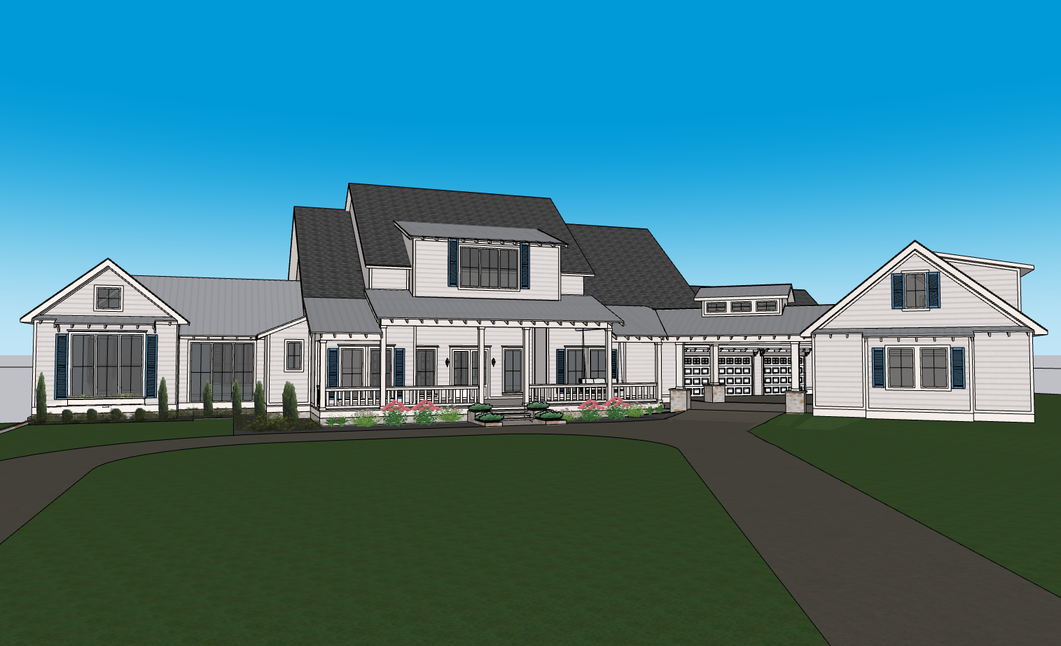 render a beautiful modern grand farmhouse with white exterior walls and dark gray roofing add detailed blue shutters and a paved driveway include an open air porte cochere with white columns with brick base one quarter of the way up them with garage doors seen behind them in the distance surround the house with lush green grass and a vibrant garden of pink and red flowers set under a clear blue sky create a warm and inviting atmosphere with soft natural lighting