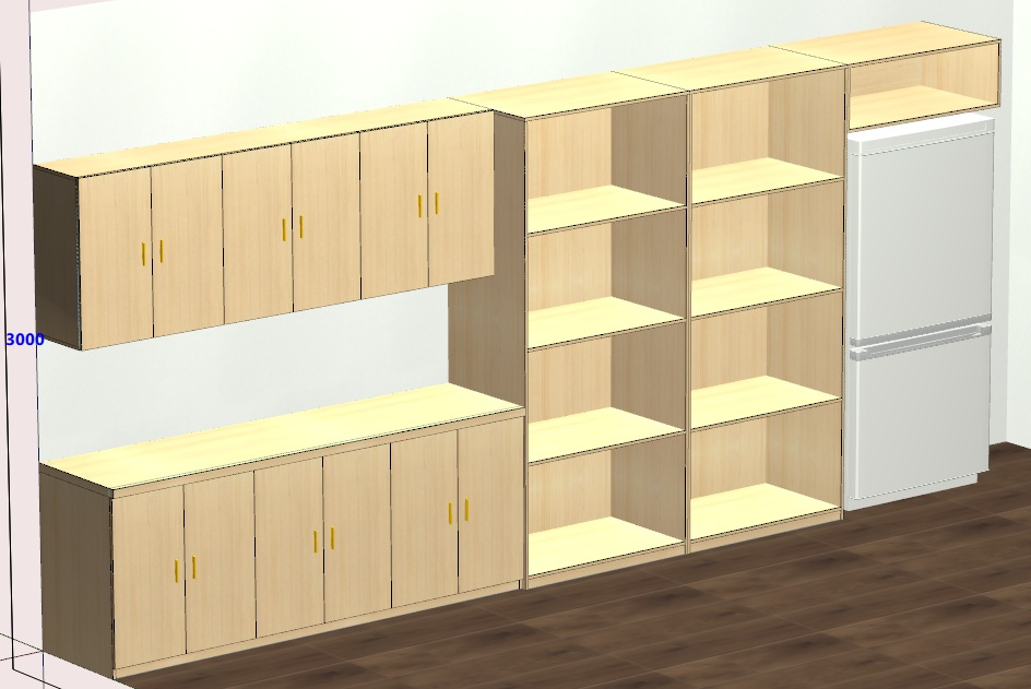 modernist exterior shot create a modern kitchen scene featuring a wall of sleek cabinets the cabinets have a light oak wood finish with golden handles shelves are lightly stained to match the cabinets displaying minimalistic decor a stainless steel refrigerator stands to the right the floor is a rich dark walnut wood for contrast the walls are painted in a soft off white creating a calm and inviting atmosphere with soft natural lighting streaming in architecture
