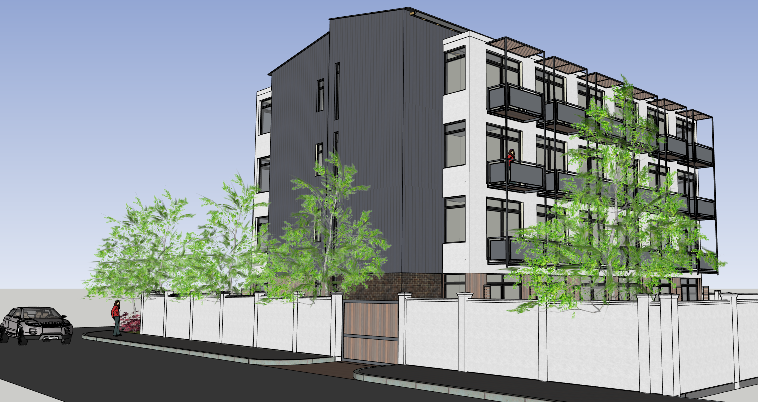 modern apartment building with bolt on metal balconies the fa ade features grey metal cladding and light render with large aluminium windows the roof is dark gray offering a contemporary touch the surrounding landscape is suburban with vibrant greenery of the lush trees and well maintained grass in light green shades the atmosphere is bright and welcoming with soft natural lighting highlighting the architectural details a few people walk casually along the sidewalk and a modern car passes nearby complementing the urban setting