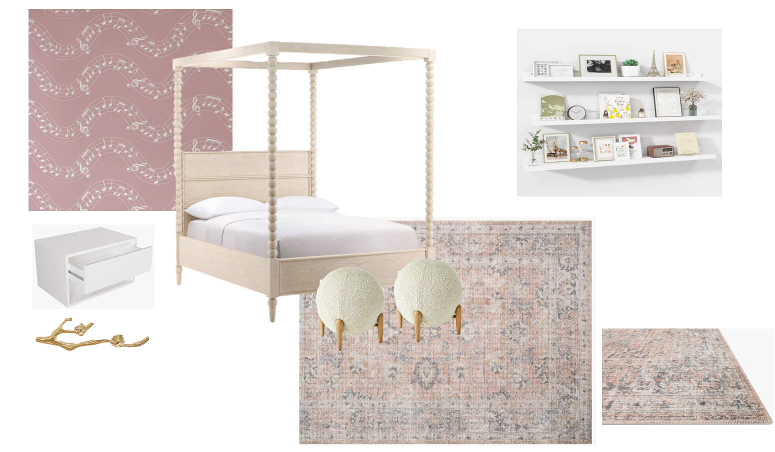 small teenagers bedroom wallcovering behind the bed floating shelves across from the bed