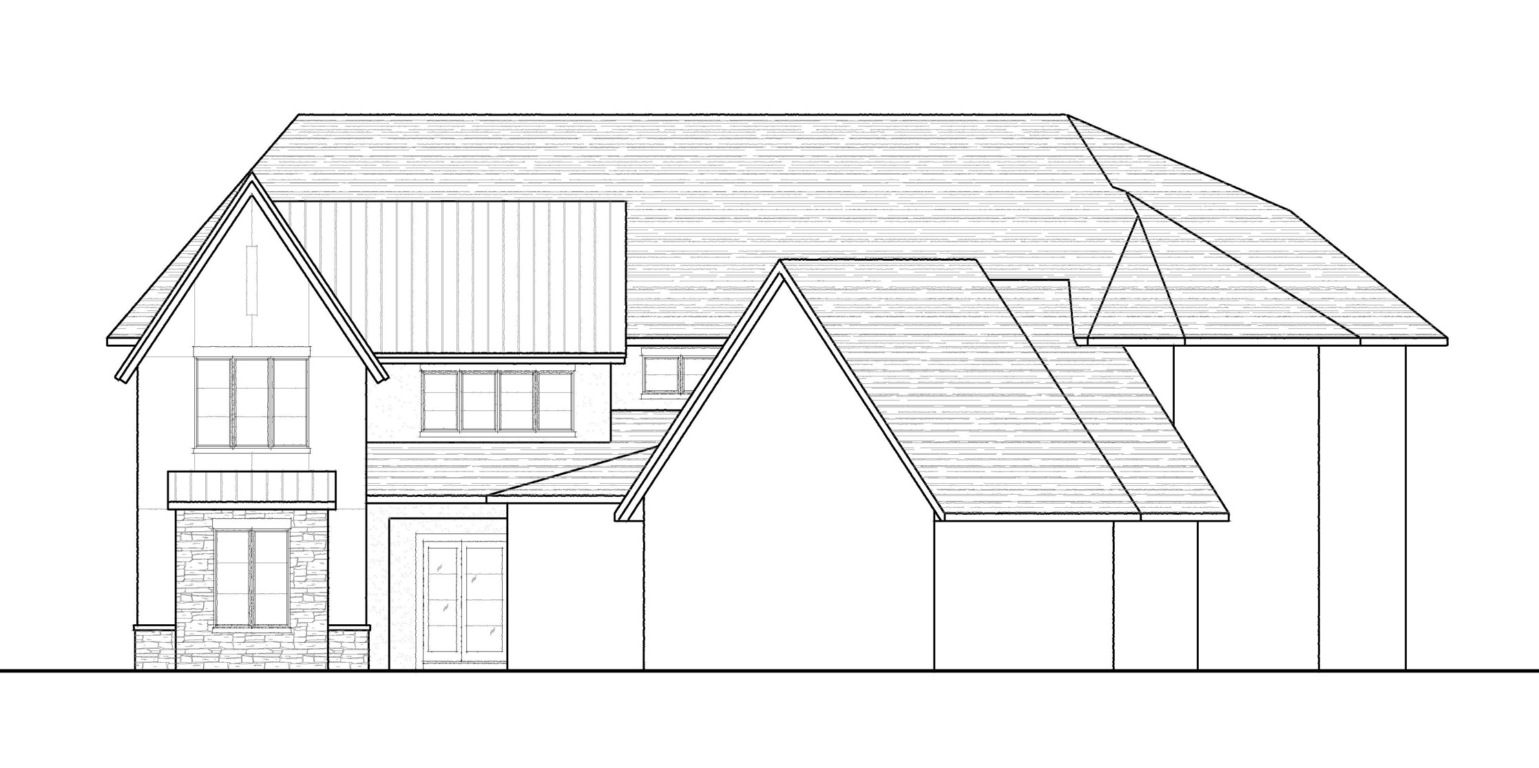 transform this 2d architectural elevation into a loose artistic black and white sketch with expressive shadowing maintain accurate proportions but reinterpret the linework with a hand drawn feel use a soft light source from the upper left introduce organic slightly imperfect line variation to mimic pen or pencil sketching apply shadow using loose cross hatching light scribble shading and varied line density rather than precise drafting techniques emphasize depth by layering sketchy shadows under roof overhangs eaves porch ffits window recesses and balconies use darker denser strokes in deeper recesses and lighter more open strokes on exposed surfaces suggest material differences siding stone roofing through texture rather than tone use varied hatching styles broken lines and subtle pattern shifts avoid solid fills and keep everything strictly black and white allow slight abstraction and artistic looseness lines can overlap taper and fade naturally the final result should feel like an architect s conceptual pen and ink elevation sketch with depth movement and character