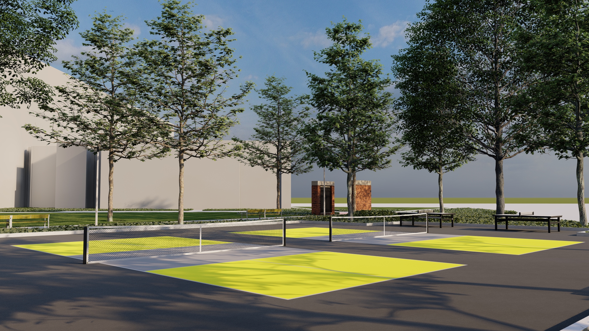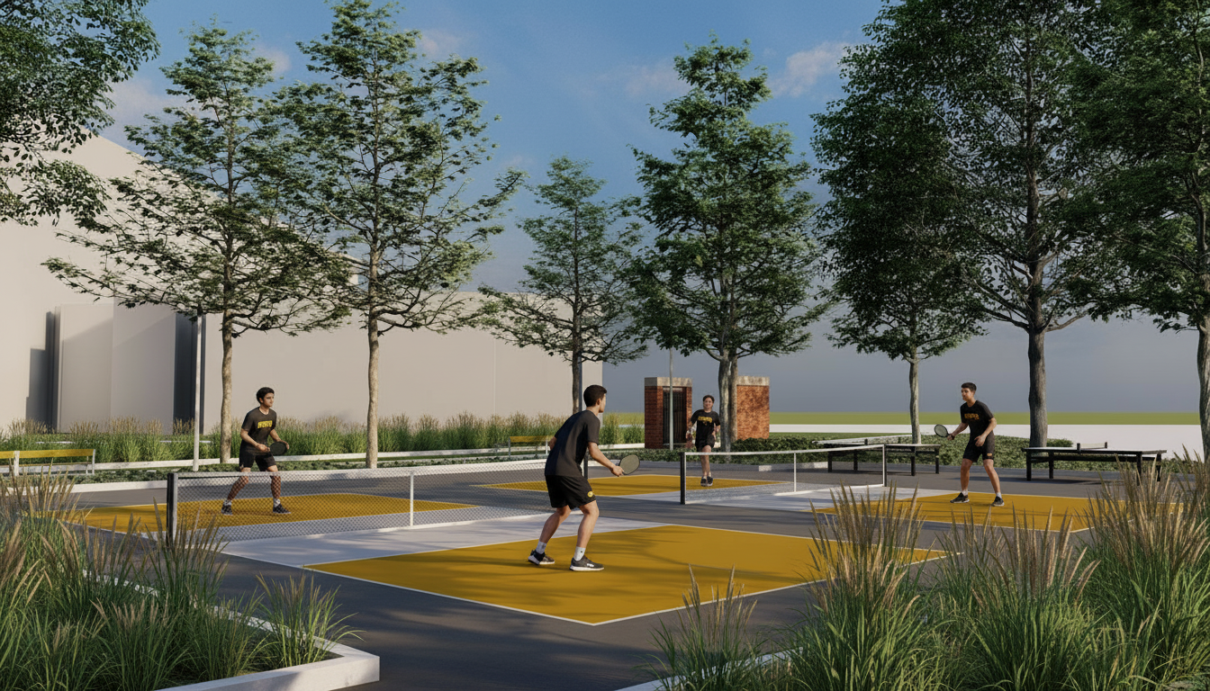 don t change the main content of the image make yellow on court university of iowa gold have students playing pickleball wearing black and gold clothes plant beds shall be short native iowa grasses make background woodland