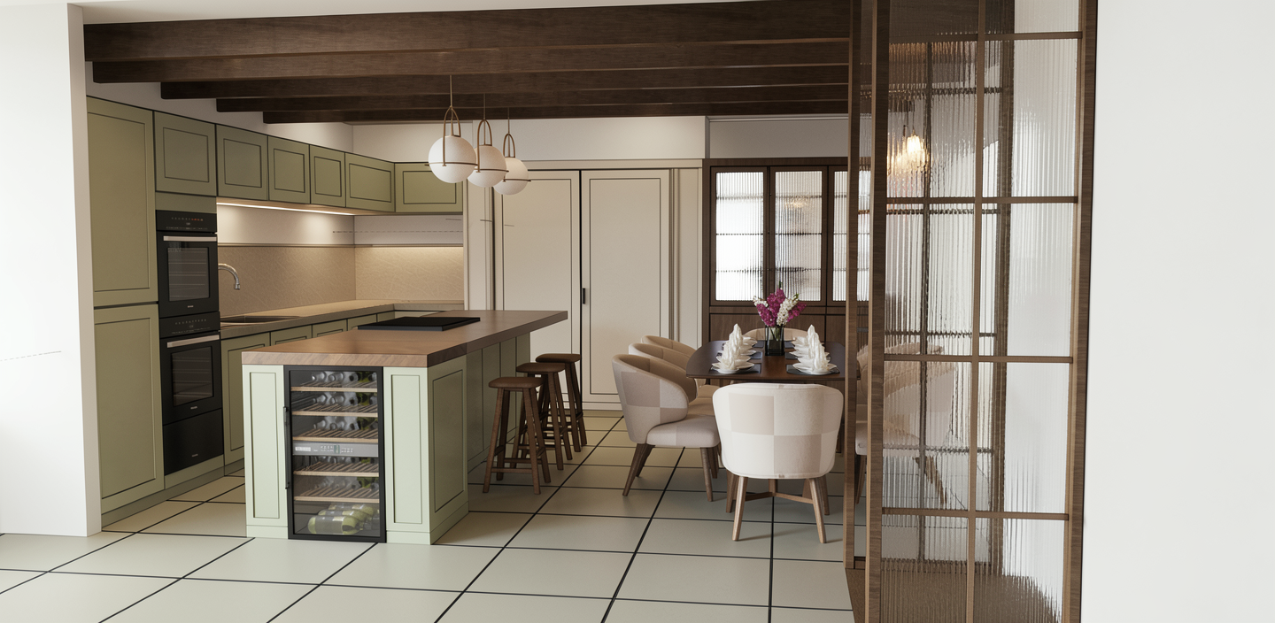 keep kitchen unit colours as they are indicated make dining chair fabric a light plain grey add reeded glass to right rear unit make no other changes to image