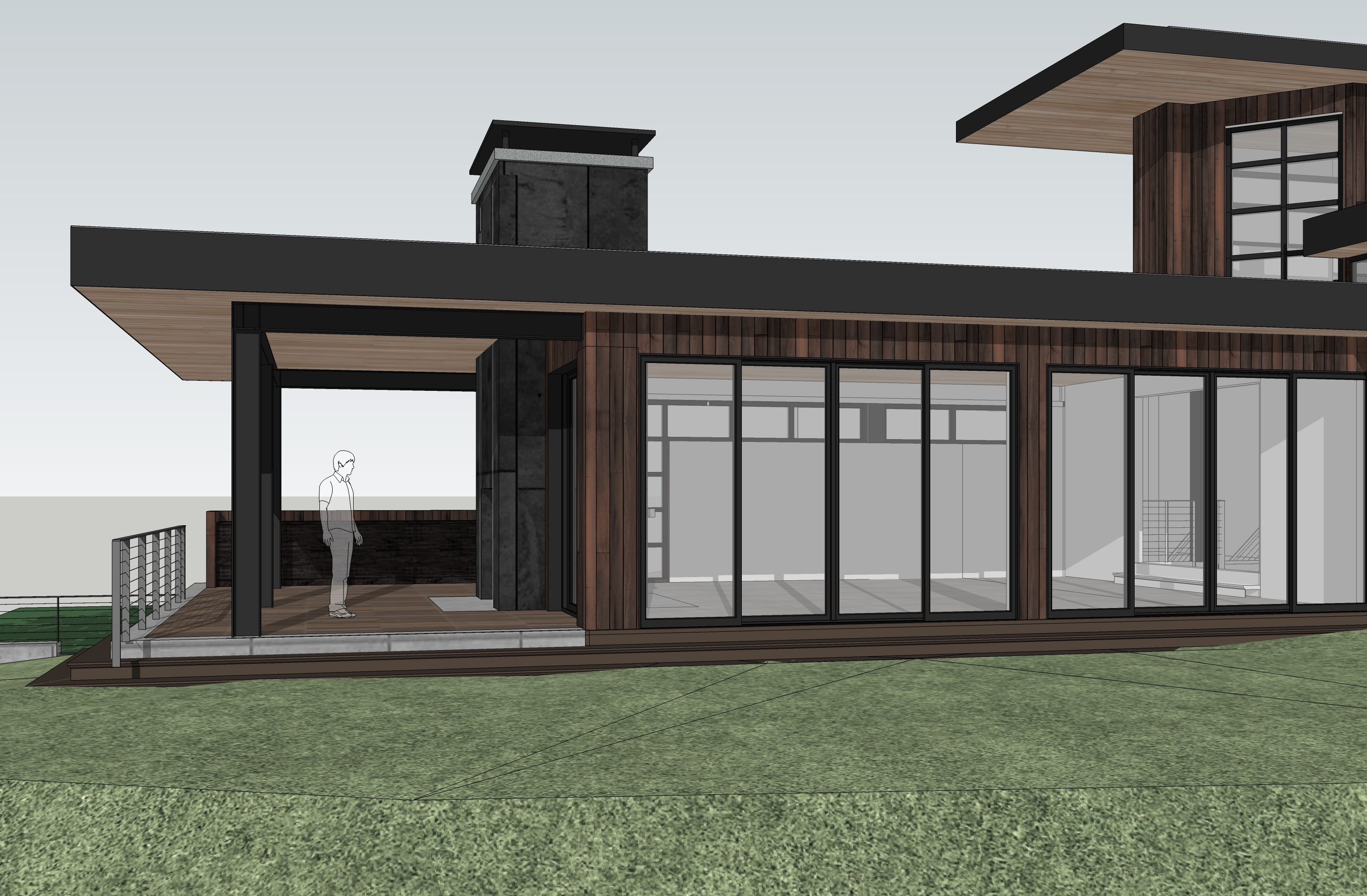 industrial home design landscaping in foreground with path fog trees in background interior lights dusk