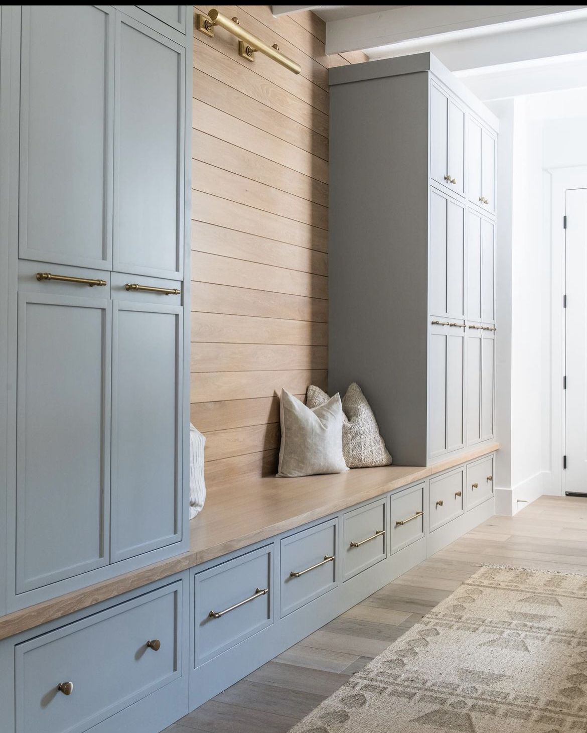 now change all the walnut colored cabinetry to a white oak lighter tone change all the cabinet hardware color to be black and add black coat hooks to the wall with horizontal siding remove the rug on the tile