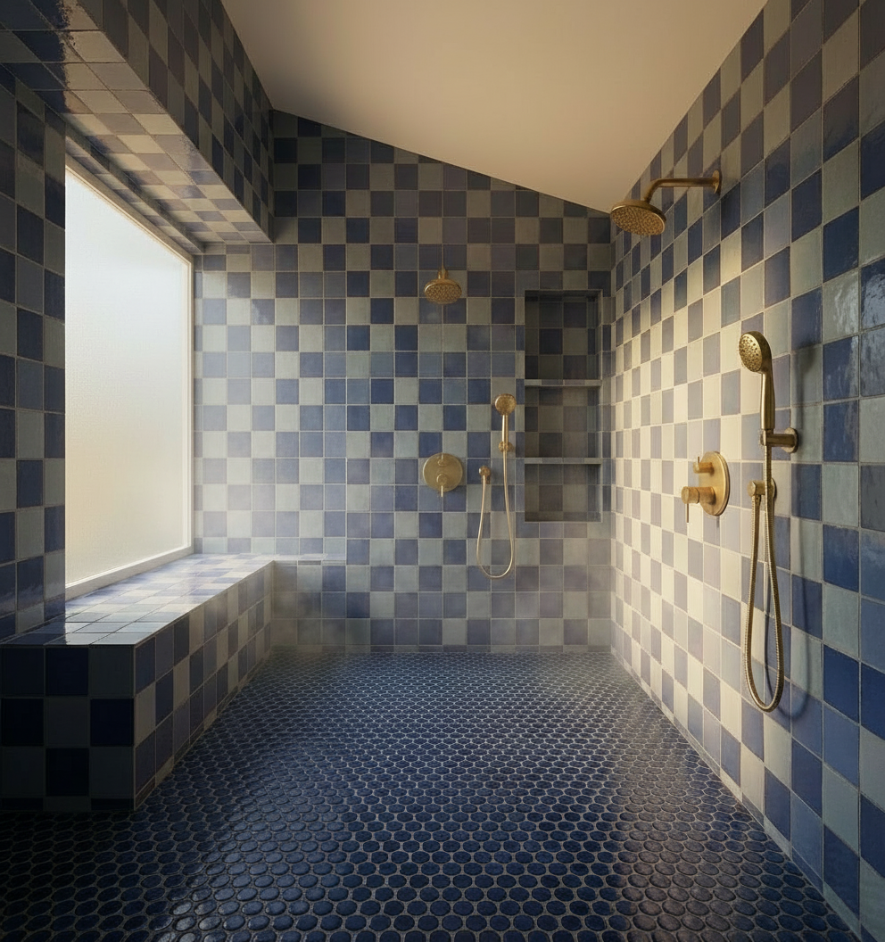 maintain the architectural constraints exactly incorporate a solid teal color aegean from zia tile into the blend into just the area that aligns with the window height add shampoo bottles to the storage shelves and add a small shaving mirror to the back wall