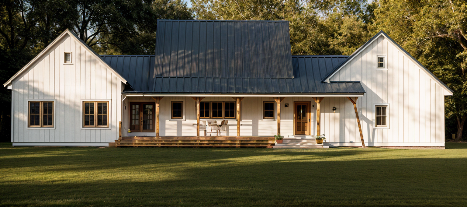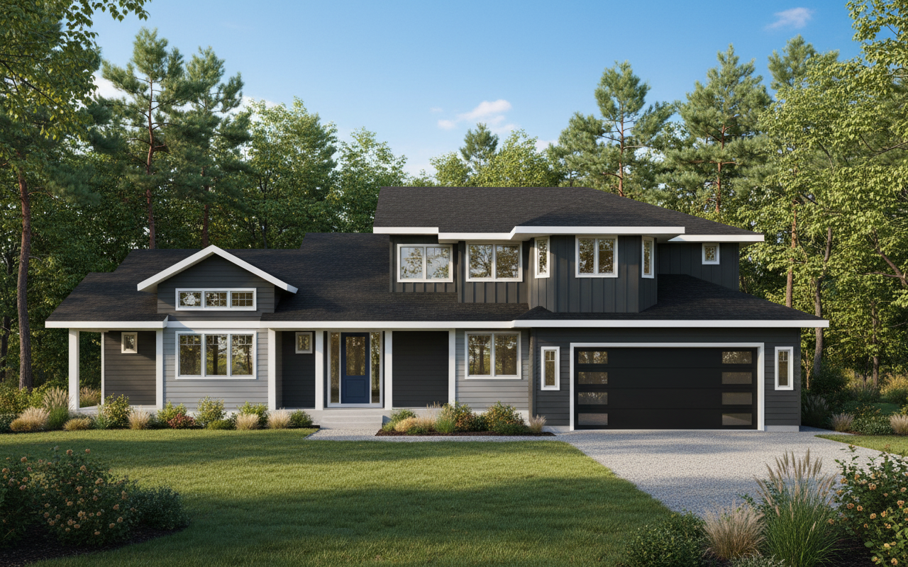 modern farmhouse with a blend of contemporary and classic design the triple car garage is located at a 45 degree angle to the main house the upper floor is built above the garage large windows with reflective glass create a sense of openness a spacious triple garage the house sits amidst a forest