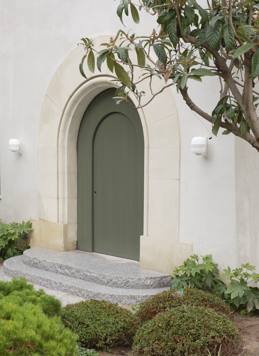 add a circular metal roof overhang thin and elegant in the same green as the door
