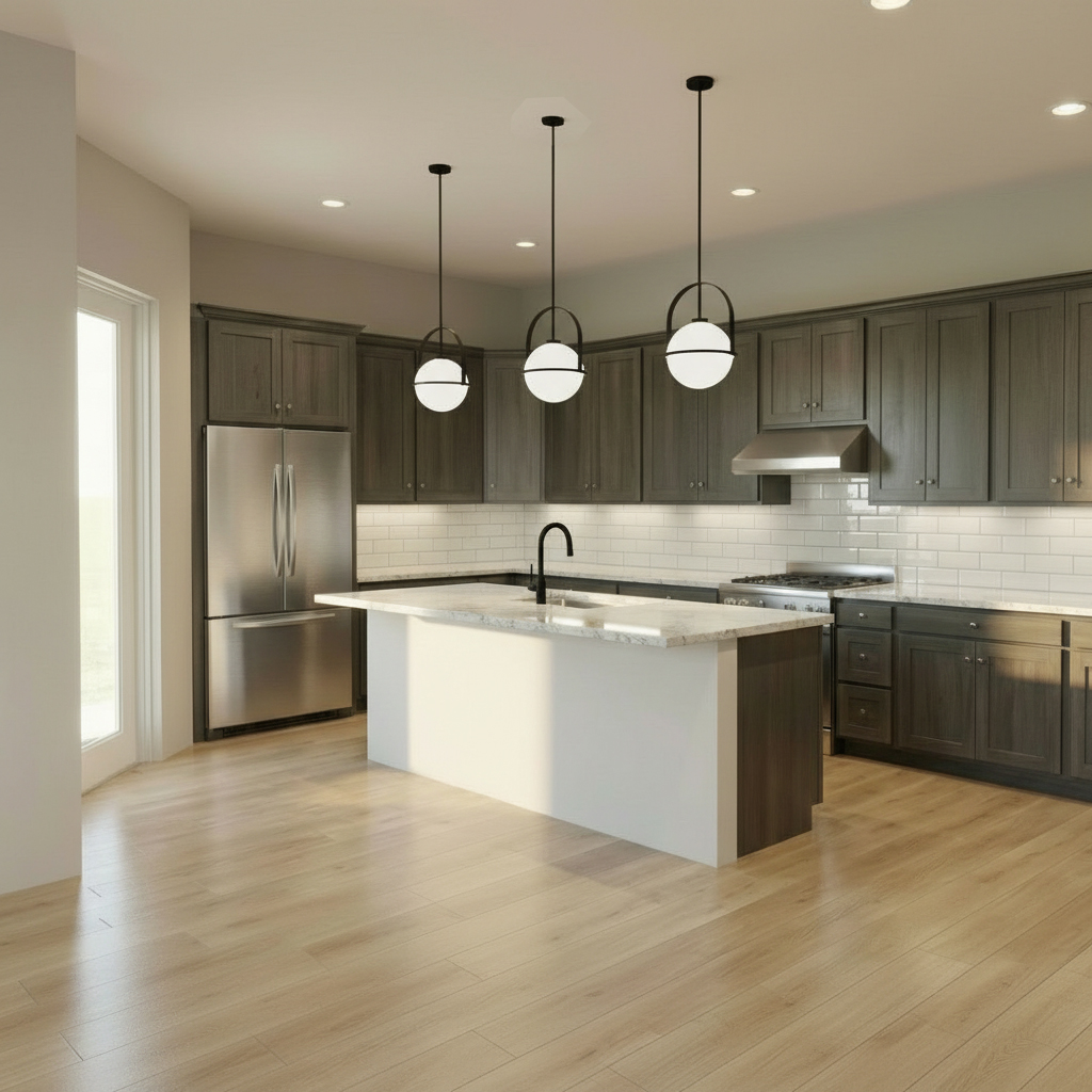 change the wall beneath the island to match the cabinet colors dark grey stain