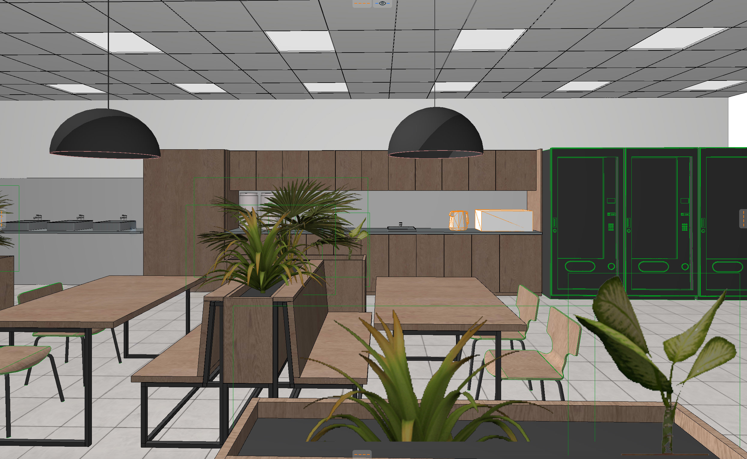 render the teapot and a microwave in the middle of the picture the white objects with orange mesh outlines