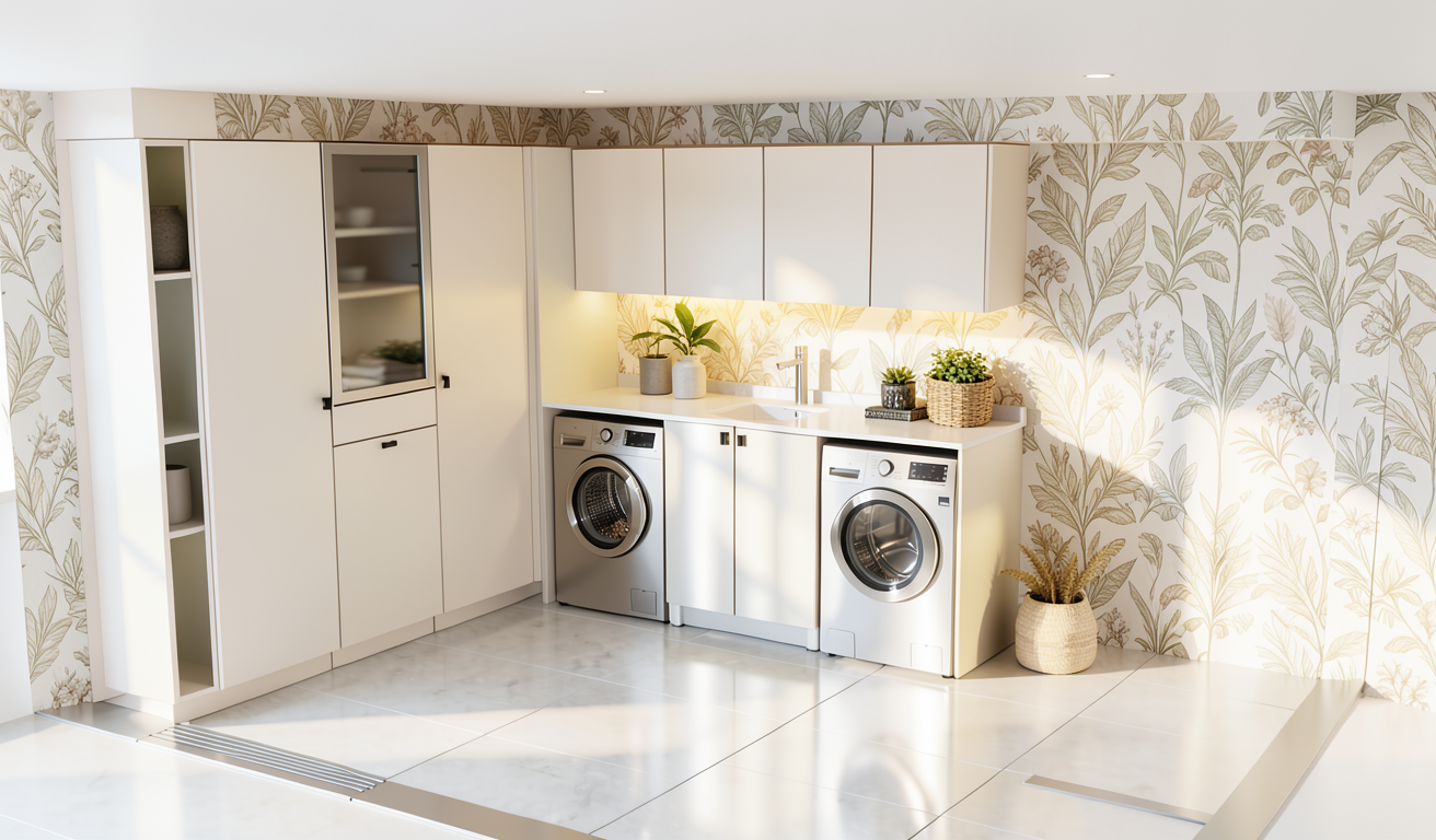tienes que poner papel pintado para cuarto de lavado decorativo quita papel pintado poner papel pintado tipo vegetal tonos claros poner decoracion quiero que las puertas todas tengan el mismo color quiero que el cristal de la vitrina sea mate quita decoracion y pon tabla de de plancha cambia el color de todos los muebles a mas claros quita reflejos y baja intensidad de la luz natural