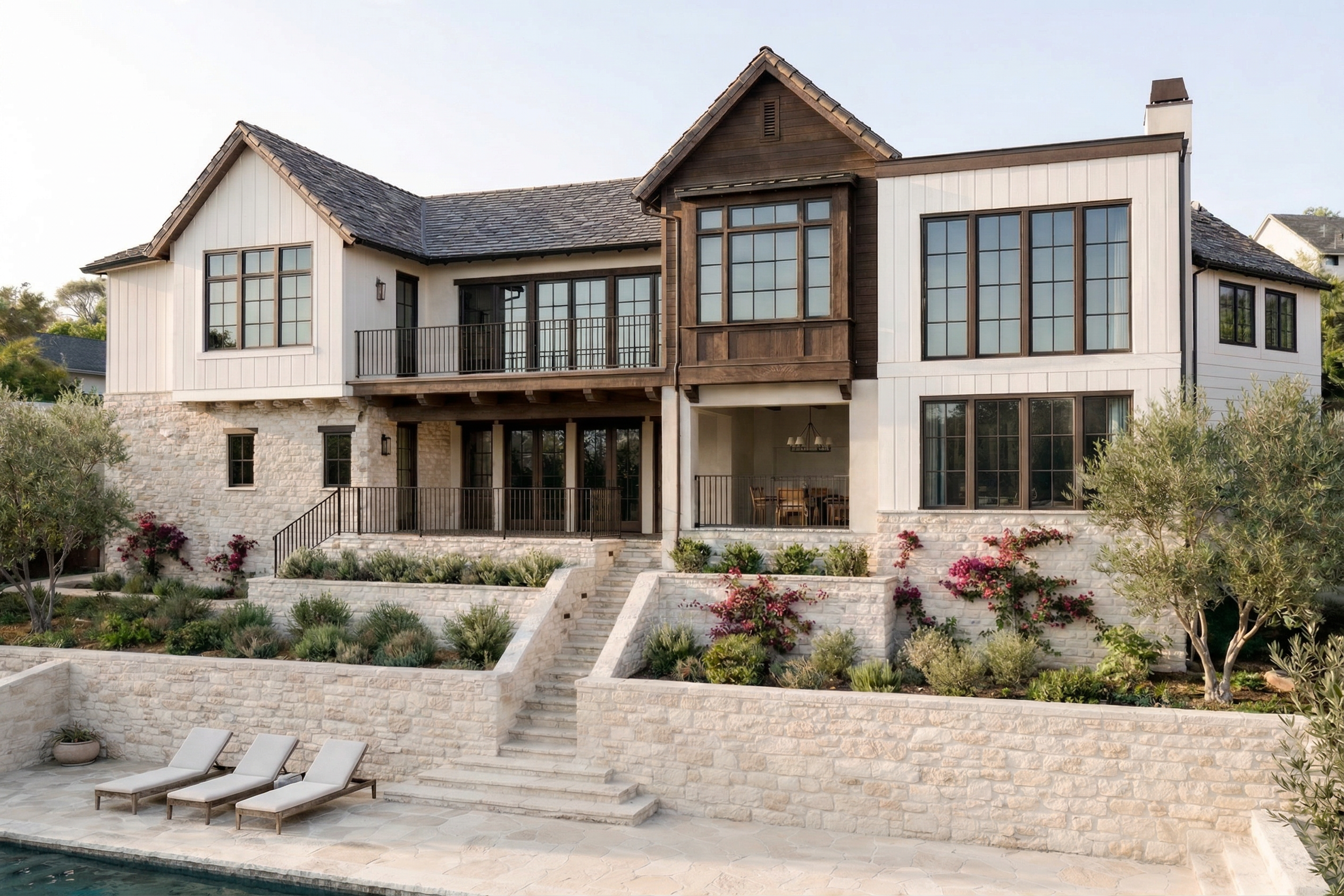 create a vertical feature add a thin dark frame around the double height window beside the entry door only the frame should be 8 12 inches wide and wrap the sides and top of this window only use dark wood or smooth paneling in a charcoal tone matching the window frames this must remain completely flush with the wall no projection no new volume no roof changes do not modify any other part of the house