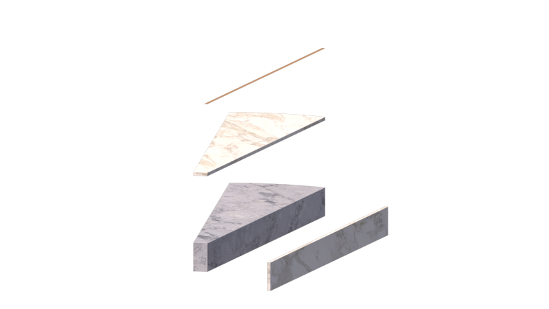 make these into realistic materials the thickest slab is concrete above that is marble and the thin strip is wood the piece on the right of the thick slab is also marble the marble is a white carrara do not change any thicknesses