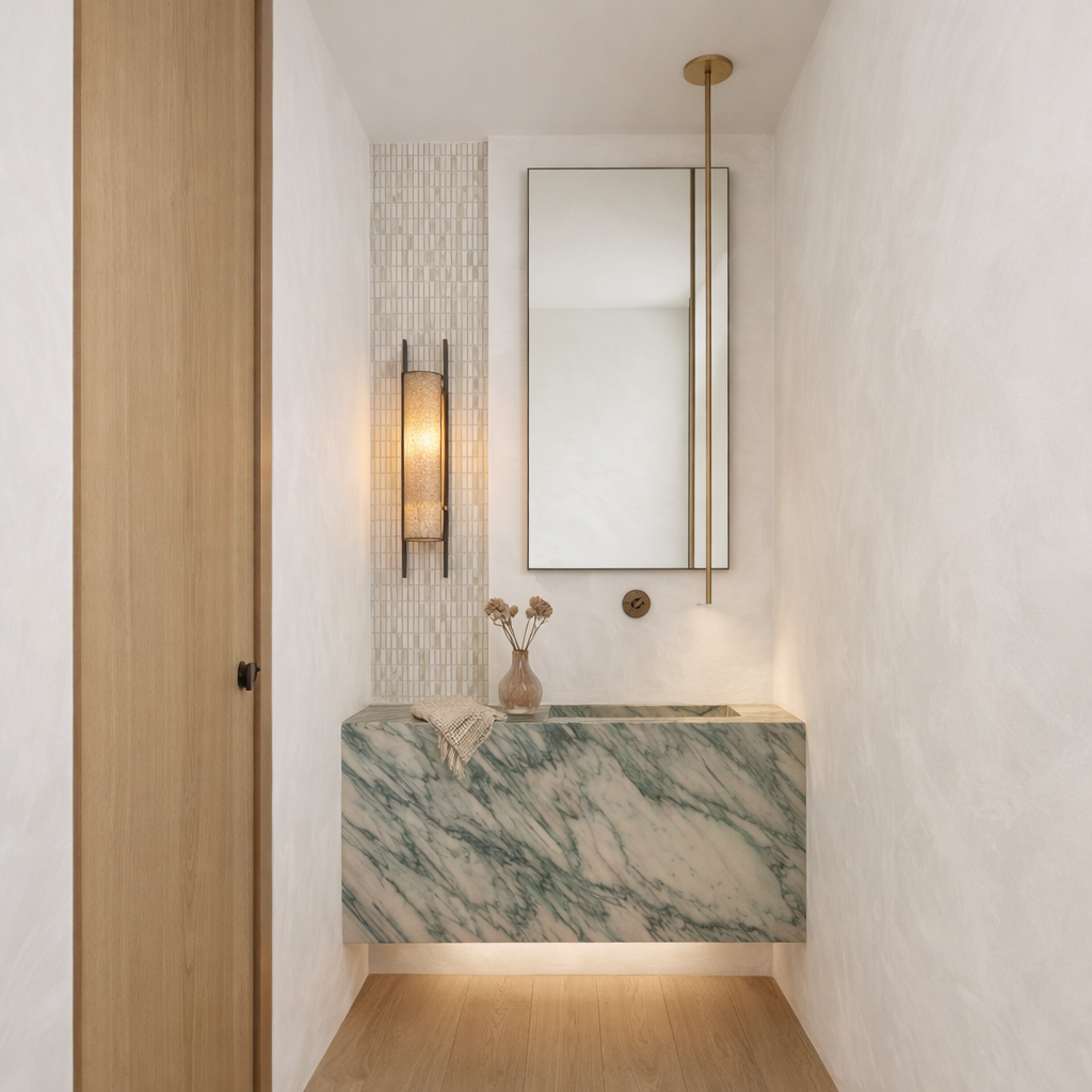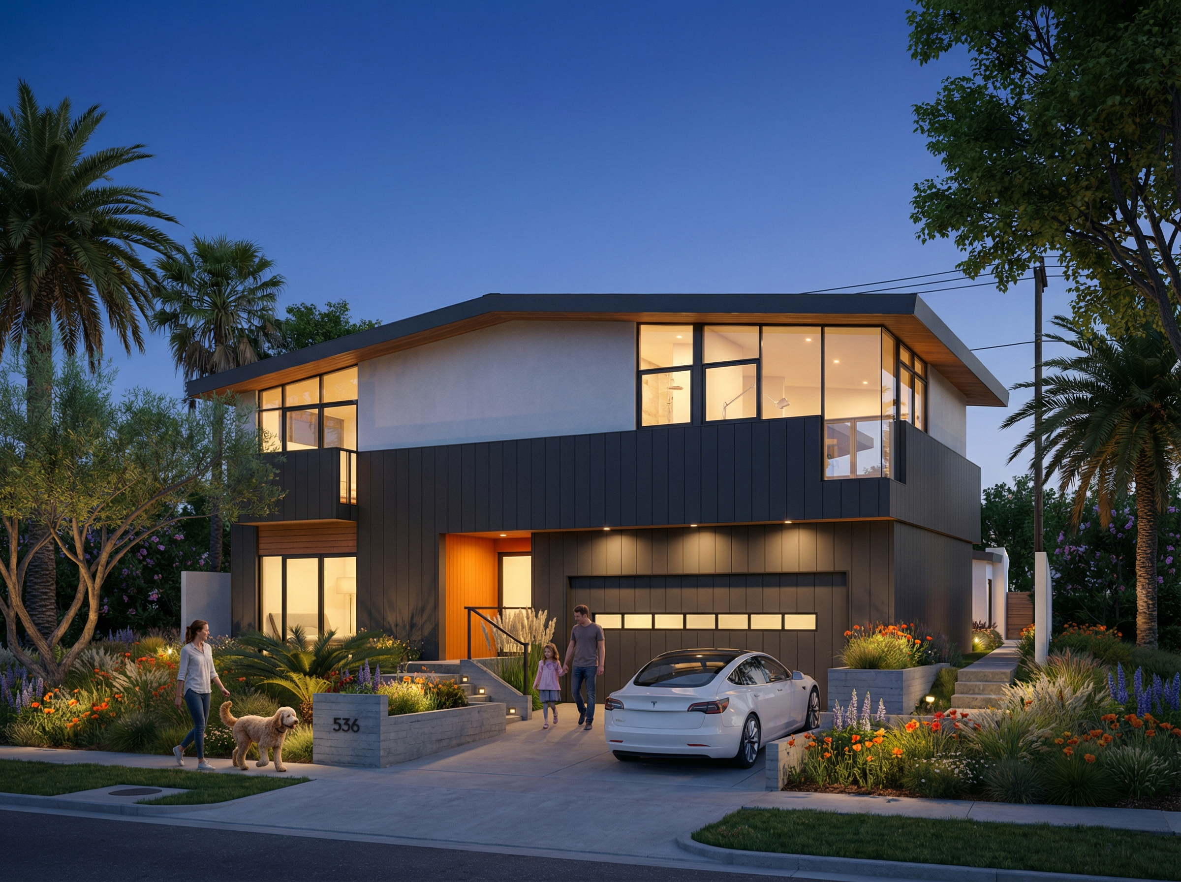 evening view lights on inside the house add california wild grasses and flowers to the landscape add grass in the the yard space enhance the glazing materials add some palms and trees adjacent to the house on the left and right sides of the view add some lights in the planting areas use the perspective view from the source image add a woman walking a golden doodle on the sidewalk add a man and girl waling towards the front entry door don t change the camera angle of the source image