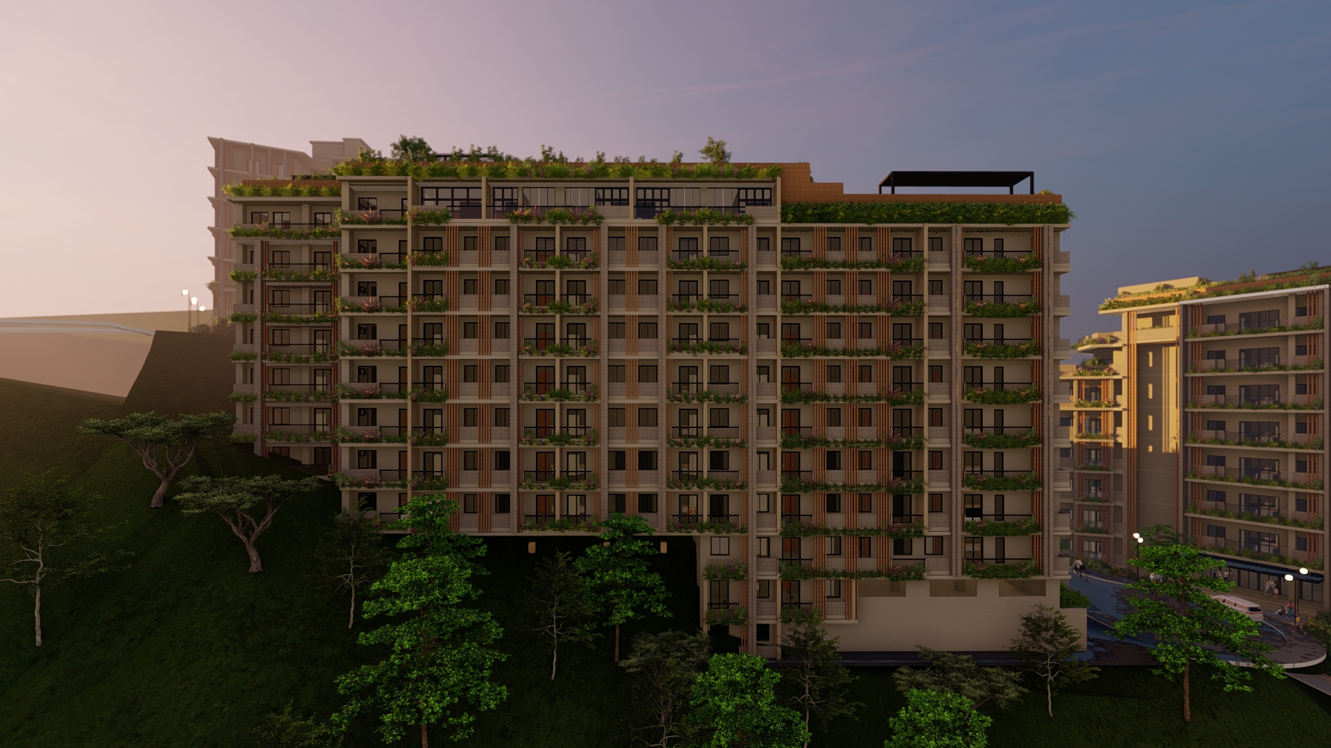 sunset lighting modern contemporary materials in warm gray tones improve plants with more variation of pines and forest trees wood slats in the facade cinematic photorealistic 4k resolution 16mm camera lens
