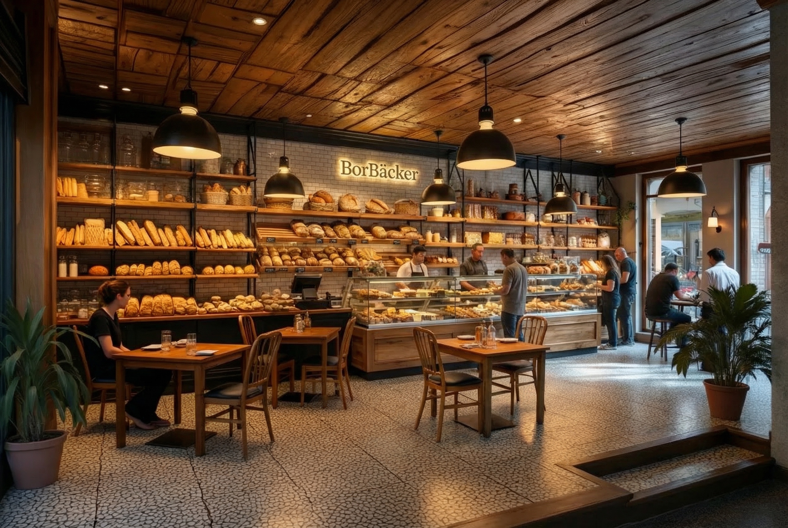 change the flooring to a more realistic high quality material such as warm natural wood or stone tiles suitable for a cozy bakery interior the floor should look authentic slightly textured and naturally lit along the window on the right side add a small step down that leads to the seating area the step should be subtle architecturally integrated and physically believable with correct proportions and realistic construction overall improve the realism of the scene with natural materials accurate lighting and believable details photorealistic interior design architecture