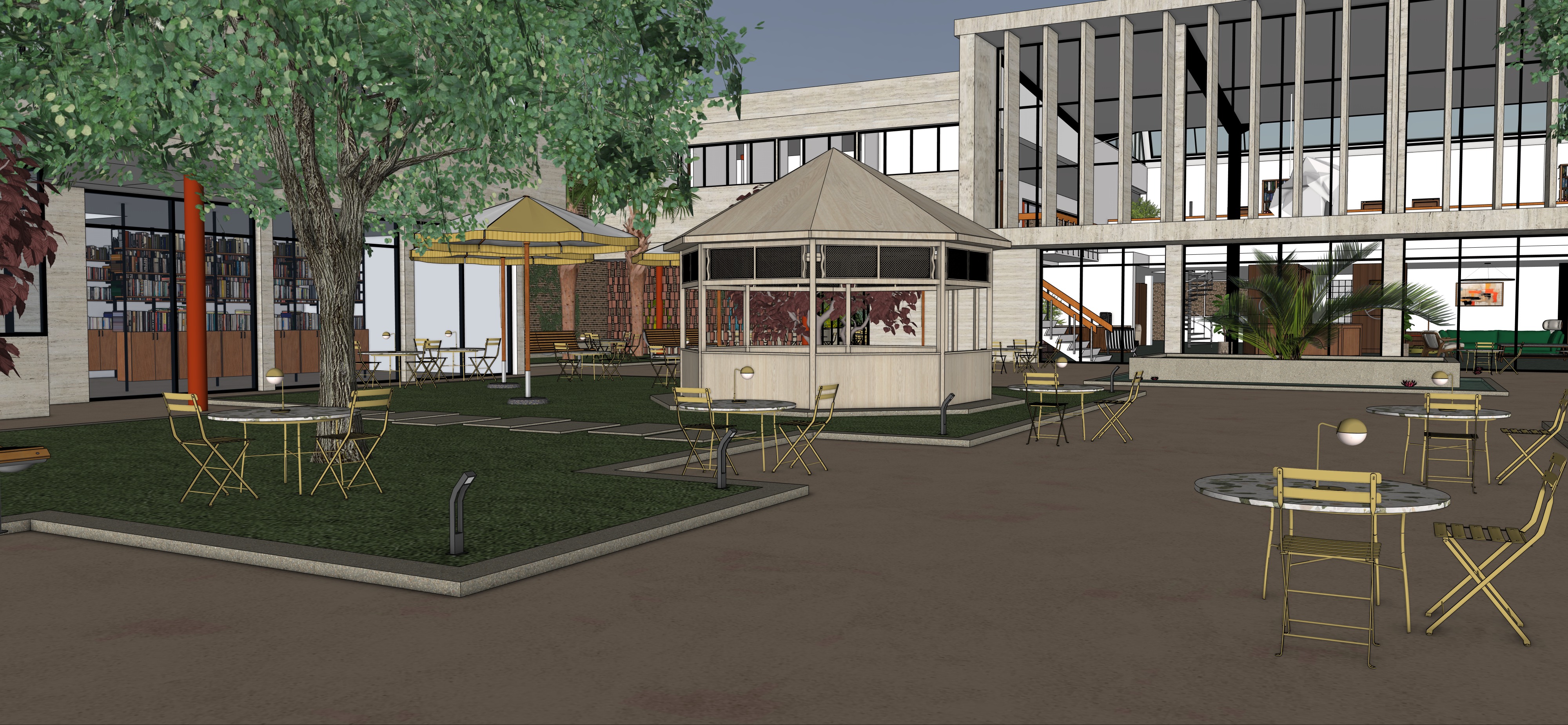 preserve the original ground material exactly as in the sketchup model the courtyard surface is compacted sand and fine gravel light beige color natural texture matte finish continuous across the space do not replace or reinterpret the ground material as concrete stone terrazzo or pavement maintain the sandy gravel surface with realistic texture subtle irregularities and natural appearance all lighting and people should integrate naturally with the existing sand and gravel ground material photorealistic architectural visualization realistic material preservation editorial architectural photography style compacted sand ground fine gravel surface sandy texture natural beige gravel preserve original material no concrete ground