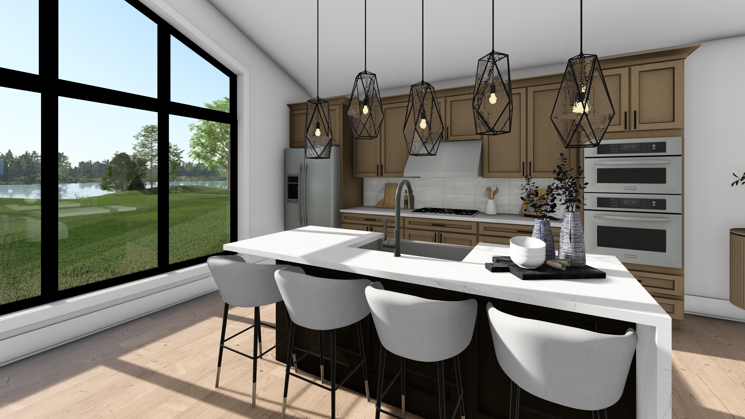 8k photorealistic image in the style of real estate photography with soft lighting and enhanced textures add lights under the cabinets and range hood and over the cabinets
