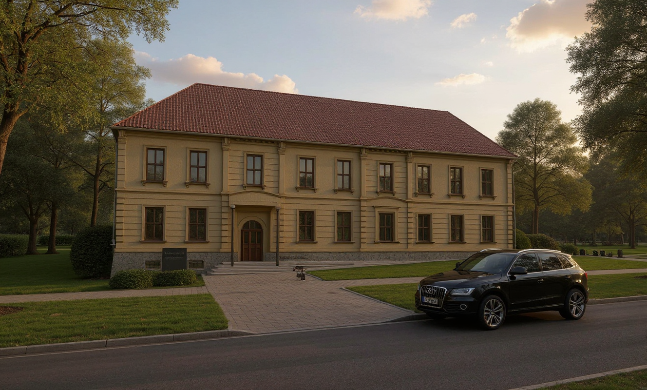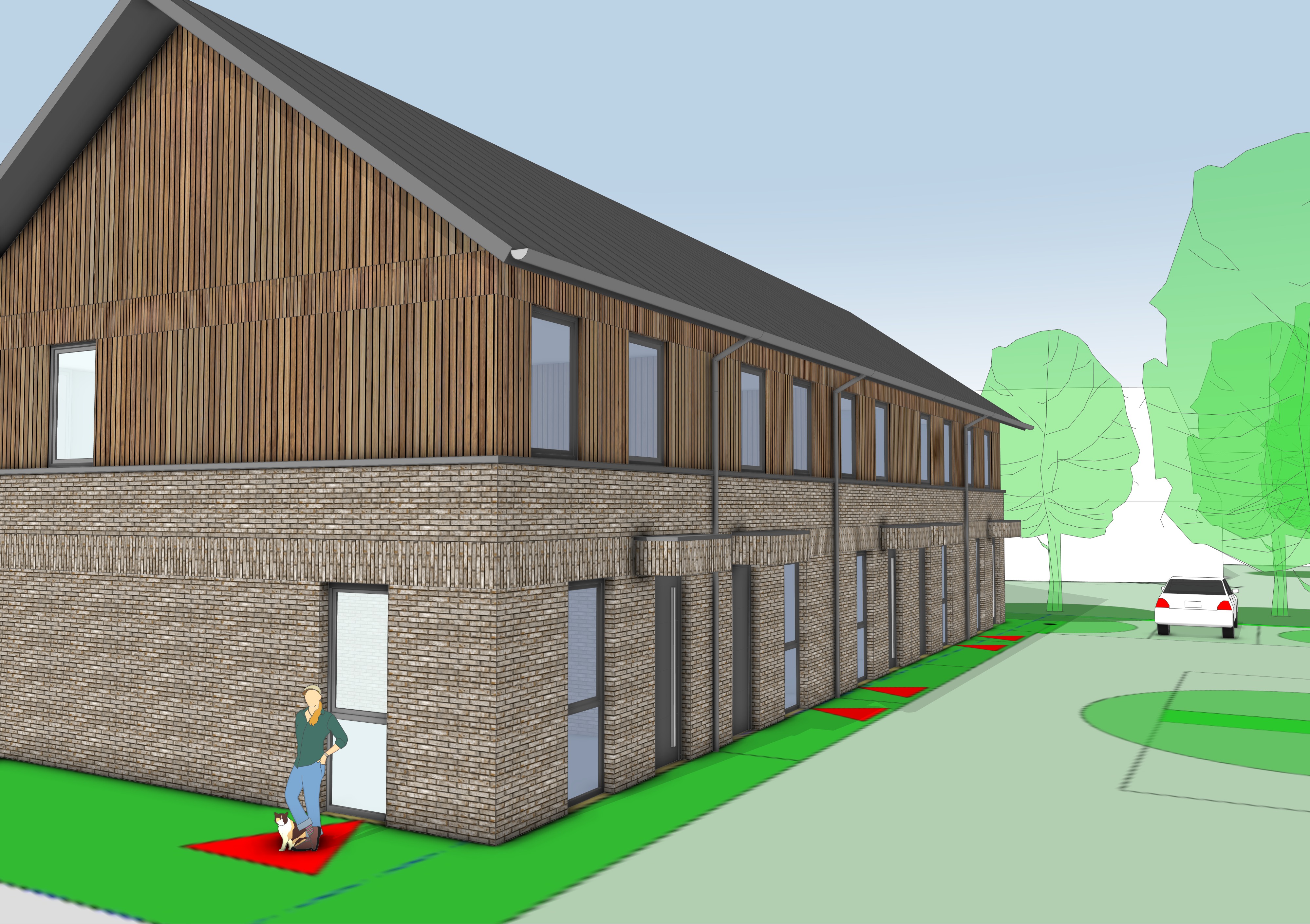 make a photorealistic rendering of the houses the weather is sunny with a few clouds in the sky add a lot of people bushes trees and flowers make the brick facades lighter and warmer in colour the time of day is the golden hour