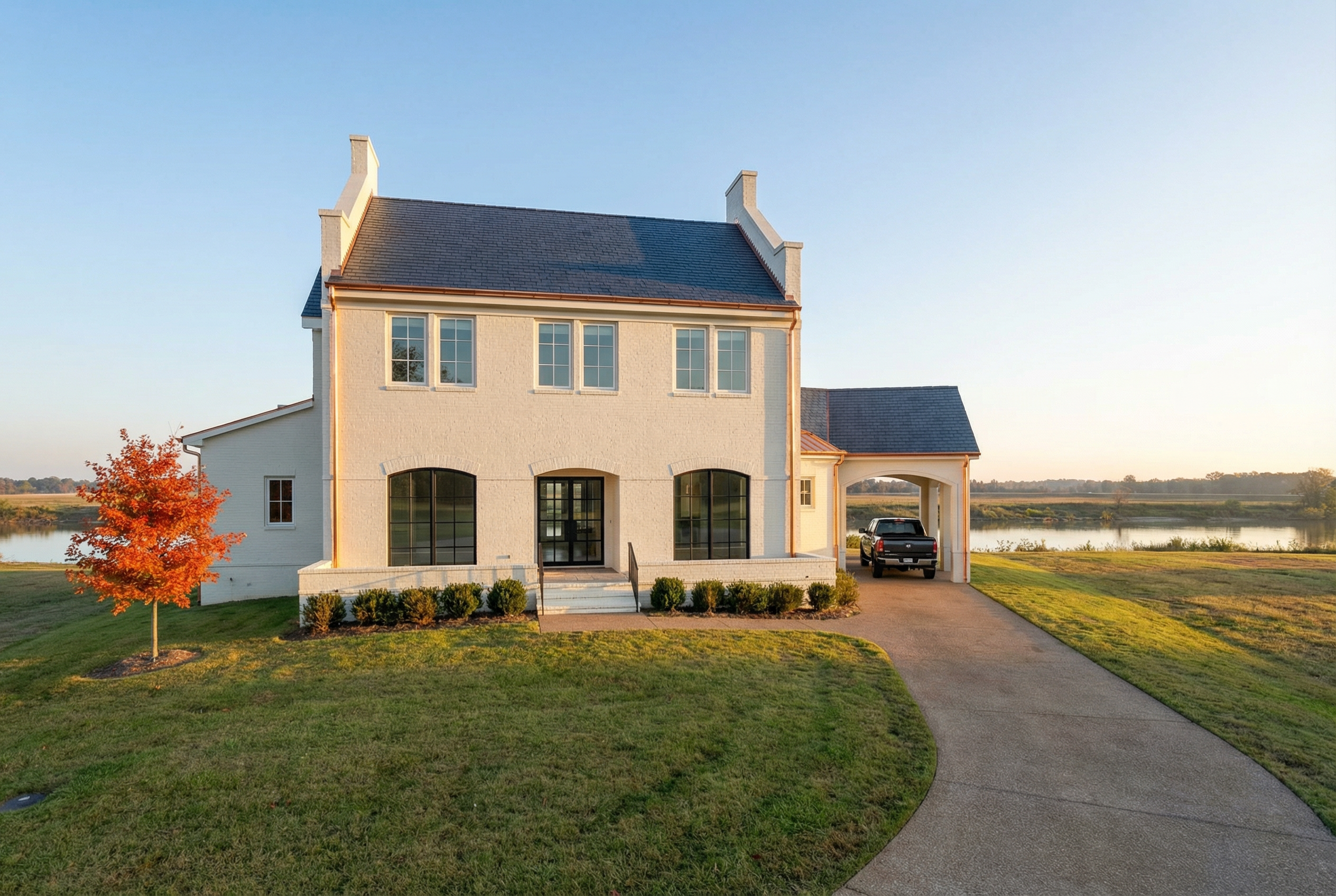 improve the lighting and make the blue slightly darker don t change anything else but change the window the be arched at top and crittal white window frame change the bar stools to something nicer