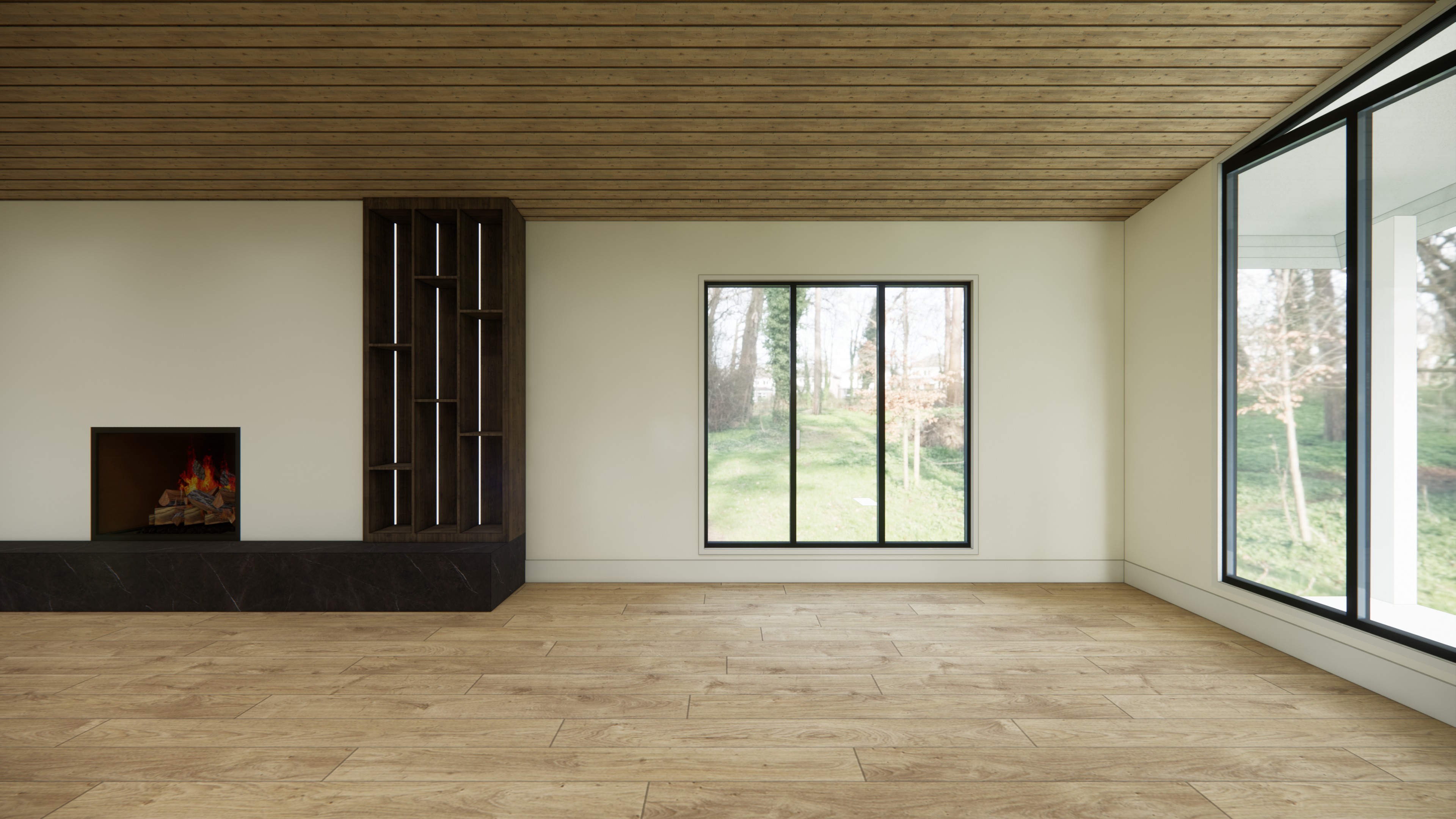 photorealistic result of the provided architectural render preserve the exact architecture layout materials furniture placement and fixtures from the original image with no redesign or modifications the purpose is only to improve realism and lighting quality the built ins to the right of the fireplace should have dimly lit led strips in the back left corner of each cubby space the led strips should run vertically the fireplace facade should be blackened hot rolled steel