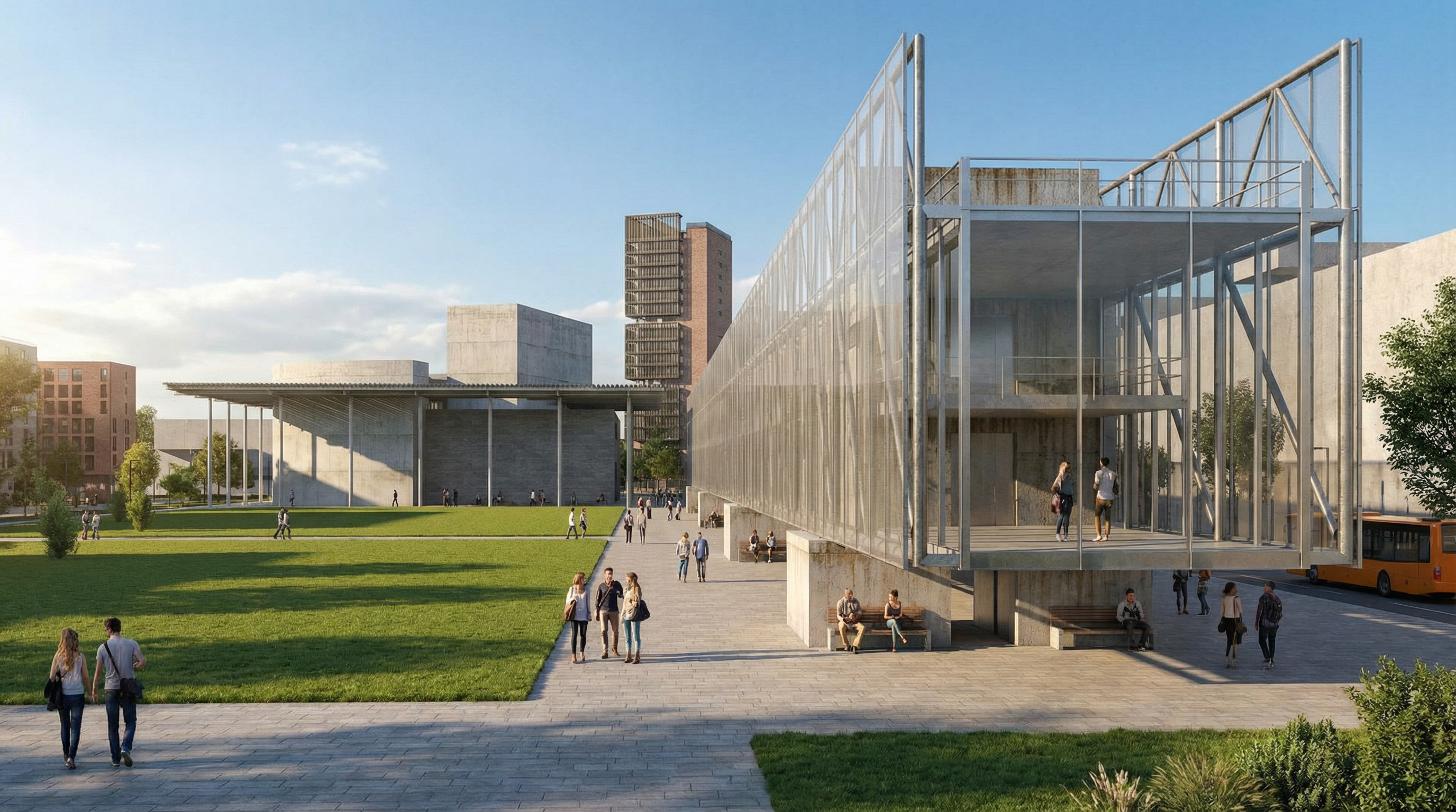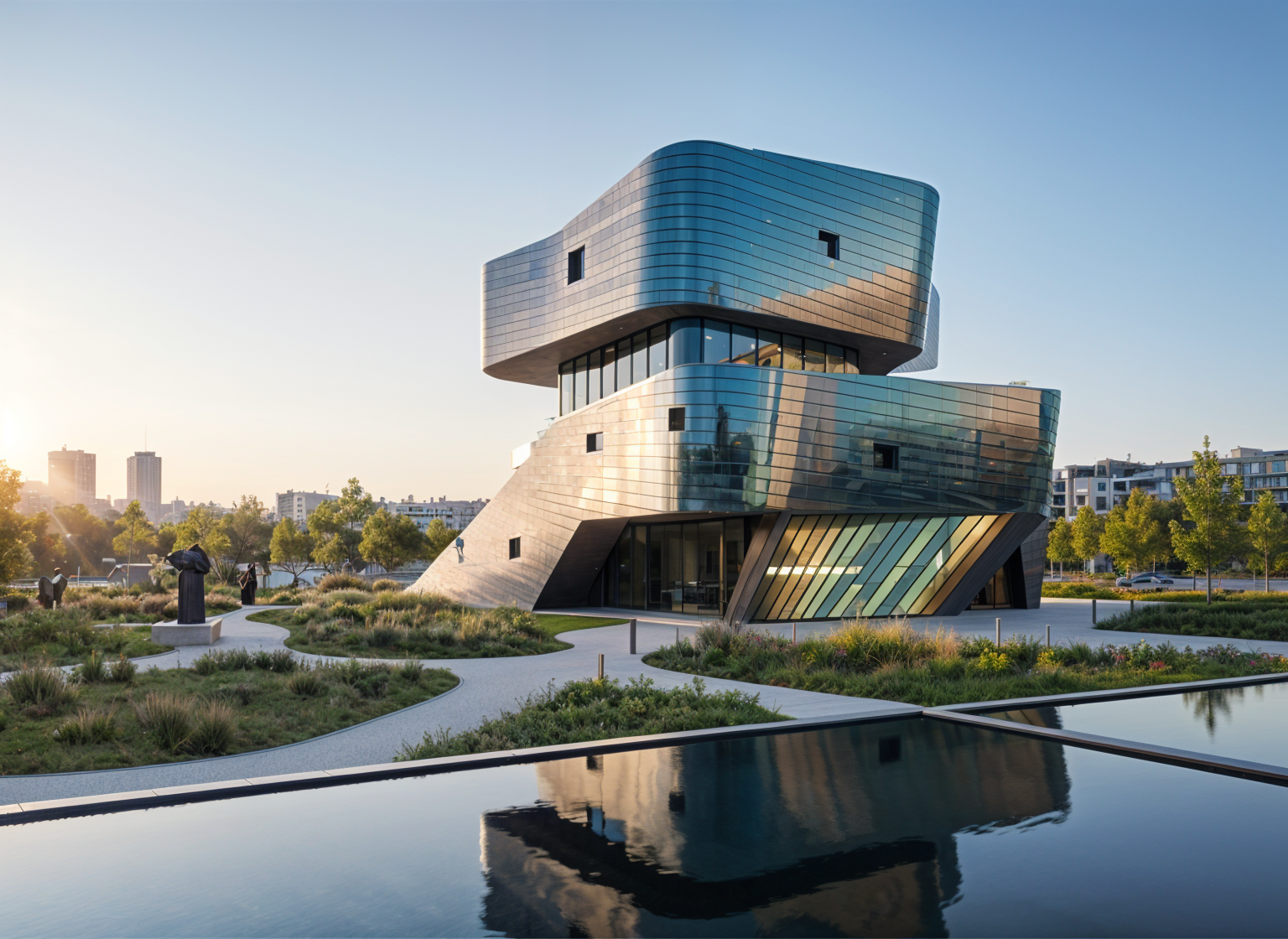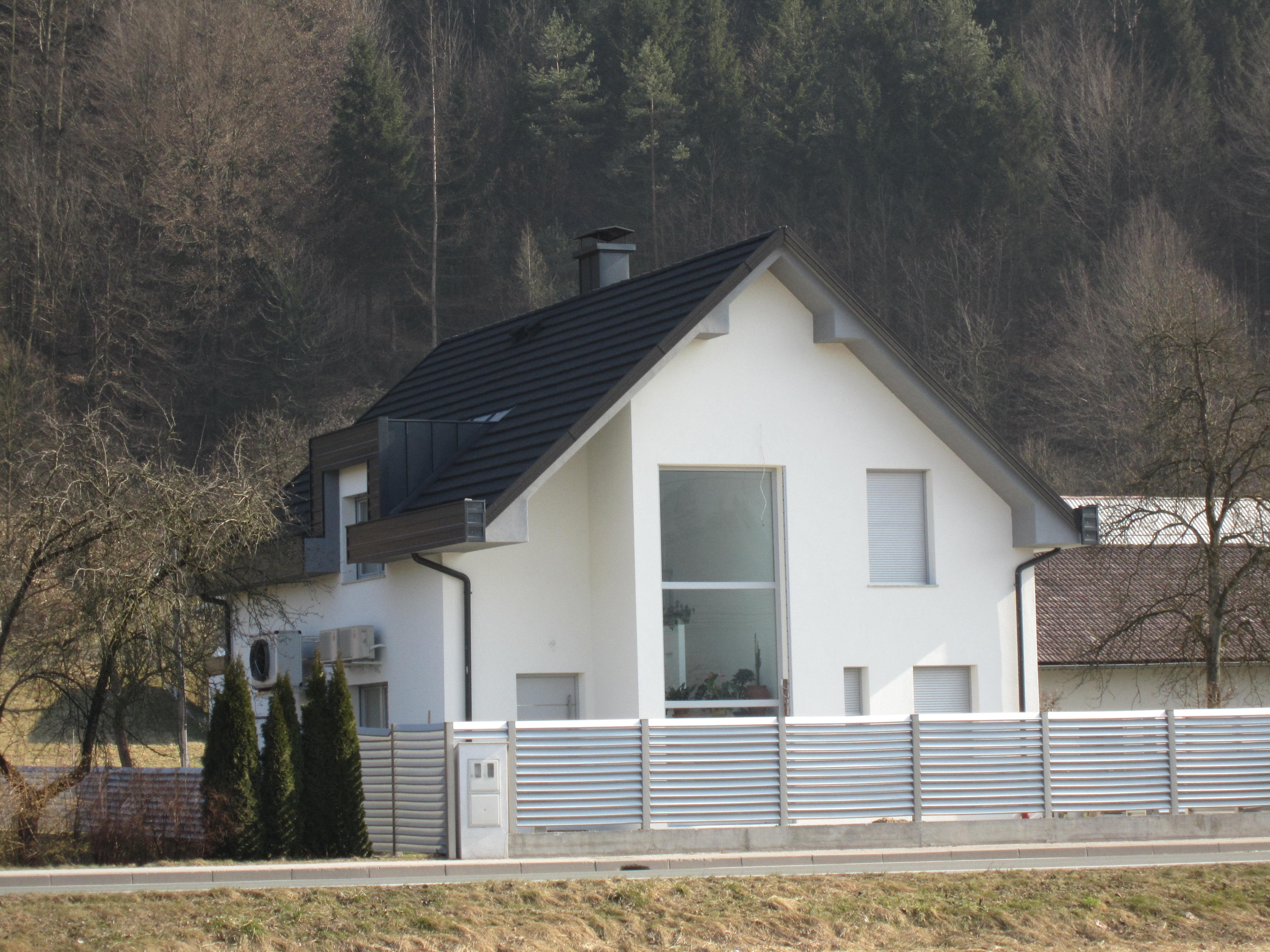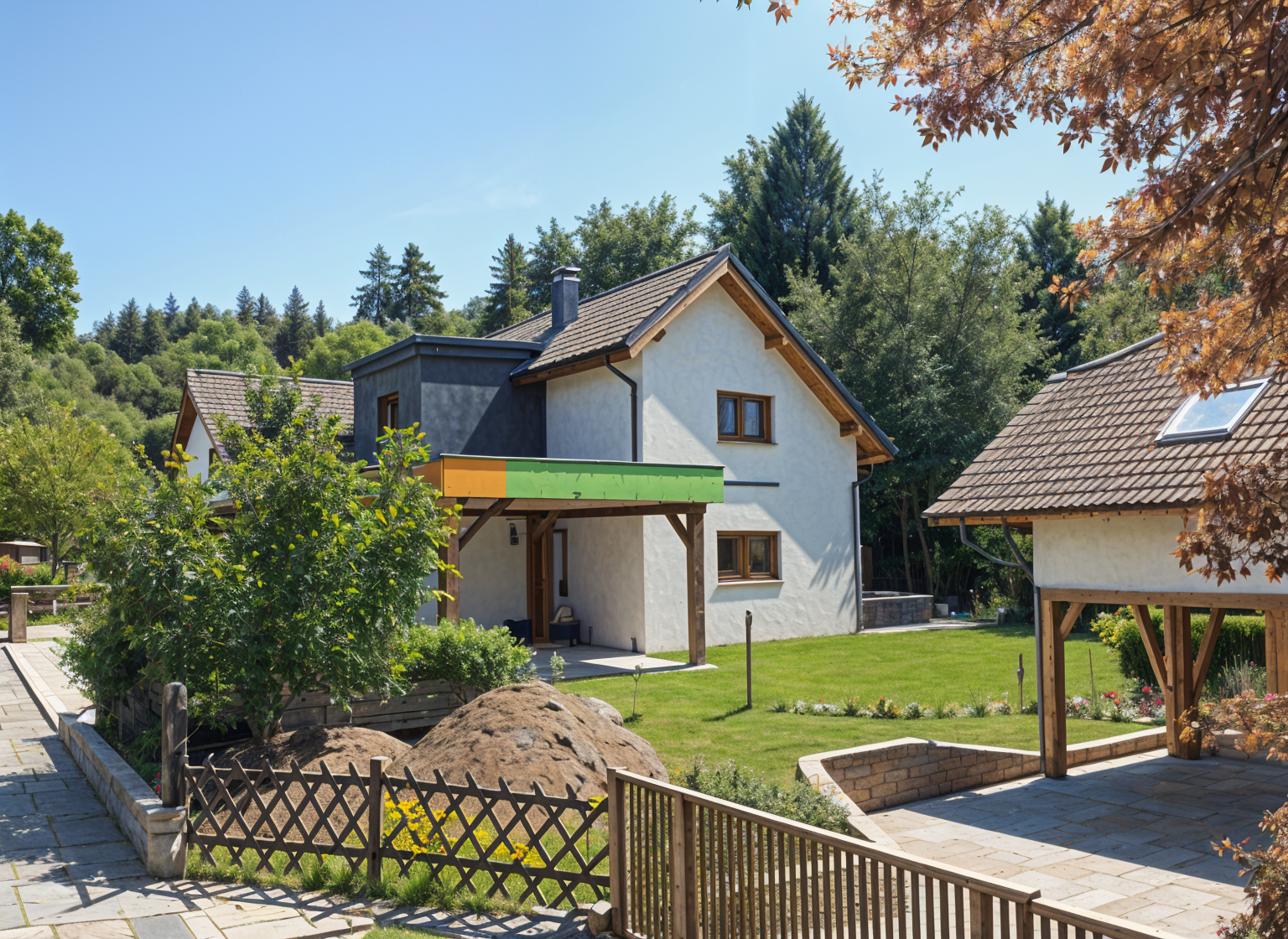 exterior shot render a serene scene of a modern white house with a sleek dark gray roof set against a lush forest background capture the house with large windows reflecting a clear sky surrounded by tall deep green conifer trees the fence is light gray complementing the house s exterior with neatly trimmed shrubs along the path the atmosphere is calm and peaceful with natural lighting illuminating the scene softly enhancing the crisp white of the house against the earthy tones of the forest architecture