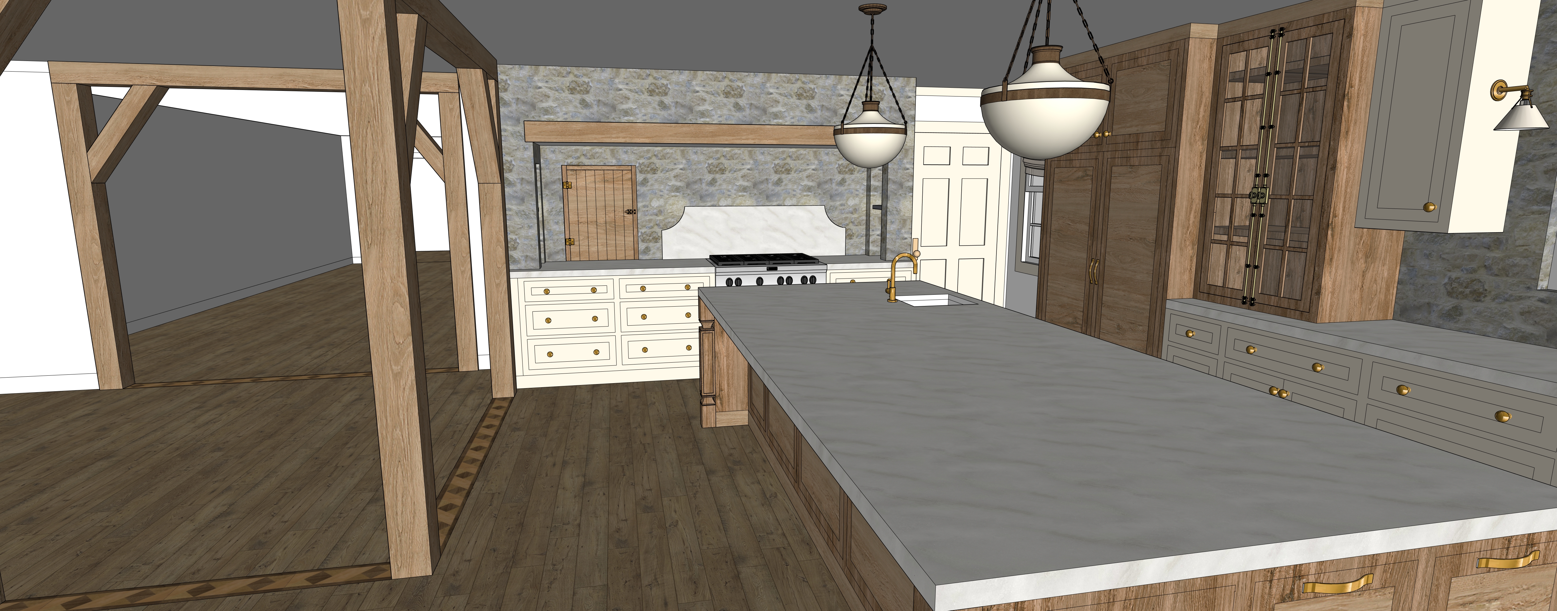 photorealistic rendering of the provided kitchen model preserve the exact architecture layout cabinetry design beam placement stone layout and camera angle do not add remove or reinterpret any built elements target mood warm serene high end european country house with strong character and age layered collected and refined not bright not flat not modern lighting soft natural daylight entering from windows with gentle diffusion exterior visible through windows should show soft out of focus greenery warm interior lighting 2800k 3000k subtle and ambient even overall illumination with soft shadows no harsh contrast no dark voids no overexposure under cabinet lighting only where cabinetry exists on walls no lighting under island countertop no added lighting over the range glass cabinets softly backlit with a warm glow pendant lights dim and warm contributing to ambiance materials stone natural limestone with creamy warm variation irregular edges and visible joint depth matte chalky texture avoid uniform or smooth appearance countertops maintain exact color and material honed finish with very low reflectivity no gloss or glare wood all wood to feel aged character grade and natural visible grain variation knots tonal shifts matte hand finished appearance island wood slightly richer in tone than perimeter cabinetry beams keep exact placement reclaimed hand hewn white oak with visible texture cracks and irregular edges warm aged tone matte finish cabinetry painted cabinetry in soft warm neutral cream stone tone no green or gray cast subtle depth at panel edges matte finish furniture addition add jacobean style barstools at the island dark stained wood with turned legs and carved detailing upholstered seats in a green and blue tapestry fabric with traditional patterning fabric should feel rich slightly muted and aged not bright or modern integrate naturally into the scene without changing island proportions or spacing atmosphere soft ambient occlusion at corners and joints balanced midtones with gentle highlights space should feel calm layered and collected with depth and character avoid glossy finishes flat or lifeless materials cool or gray color cast overly bright or overly dark rendering builder grade uniformity maintain exact geometry and perspective