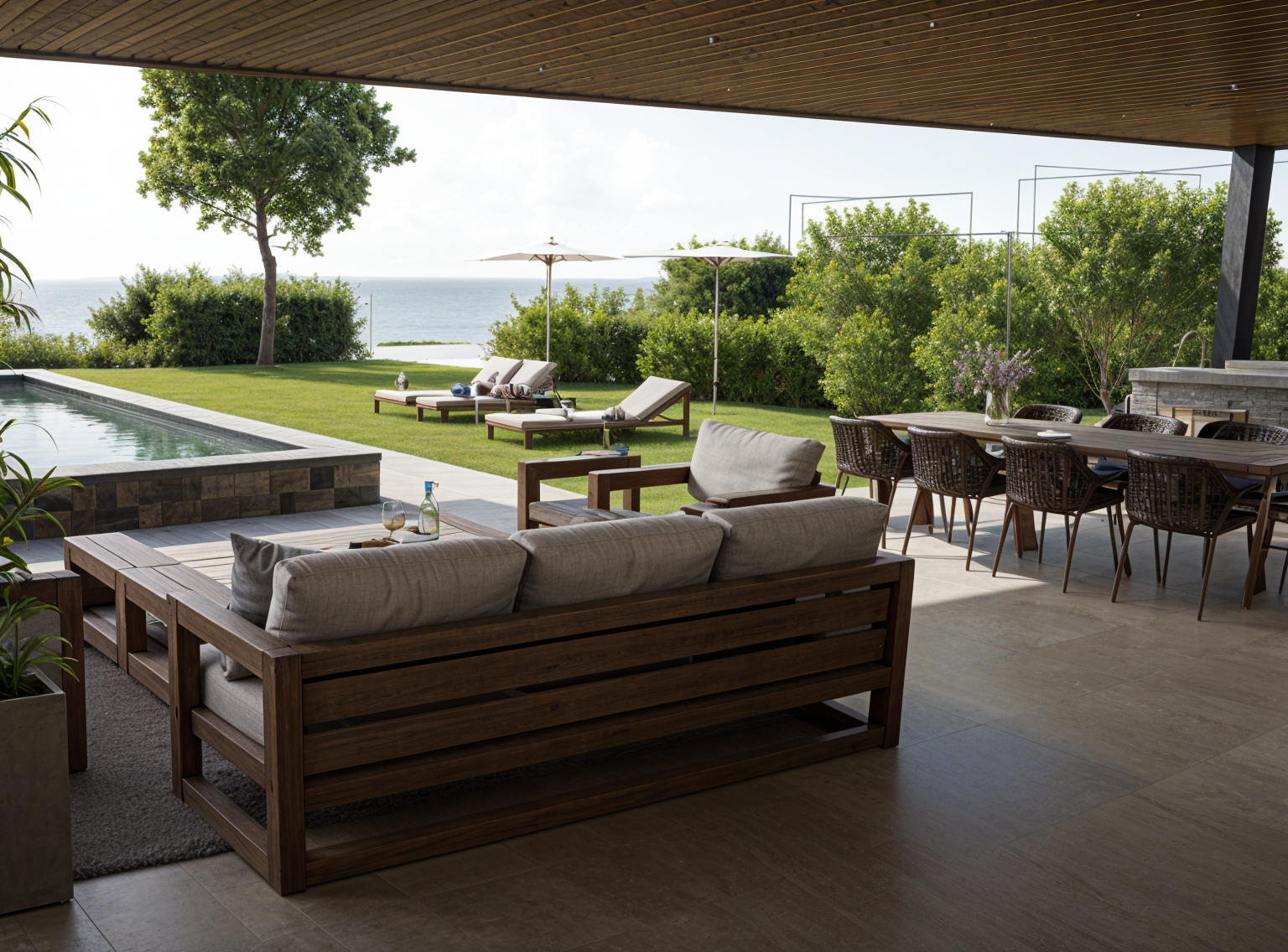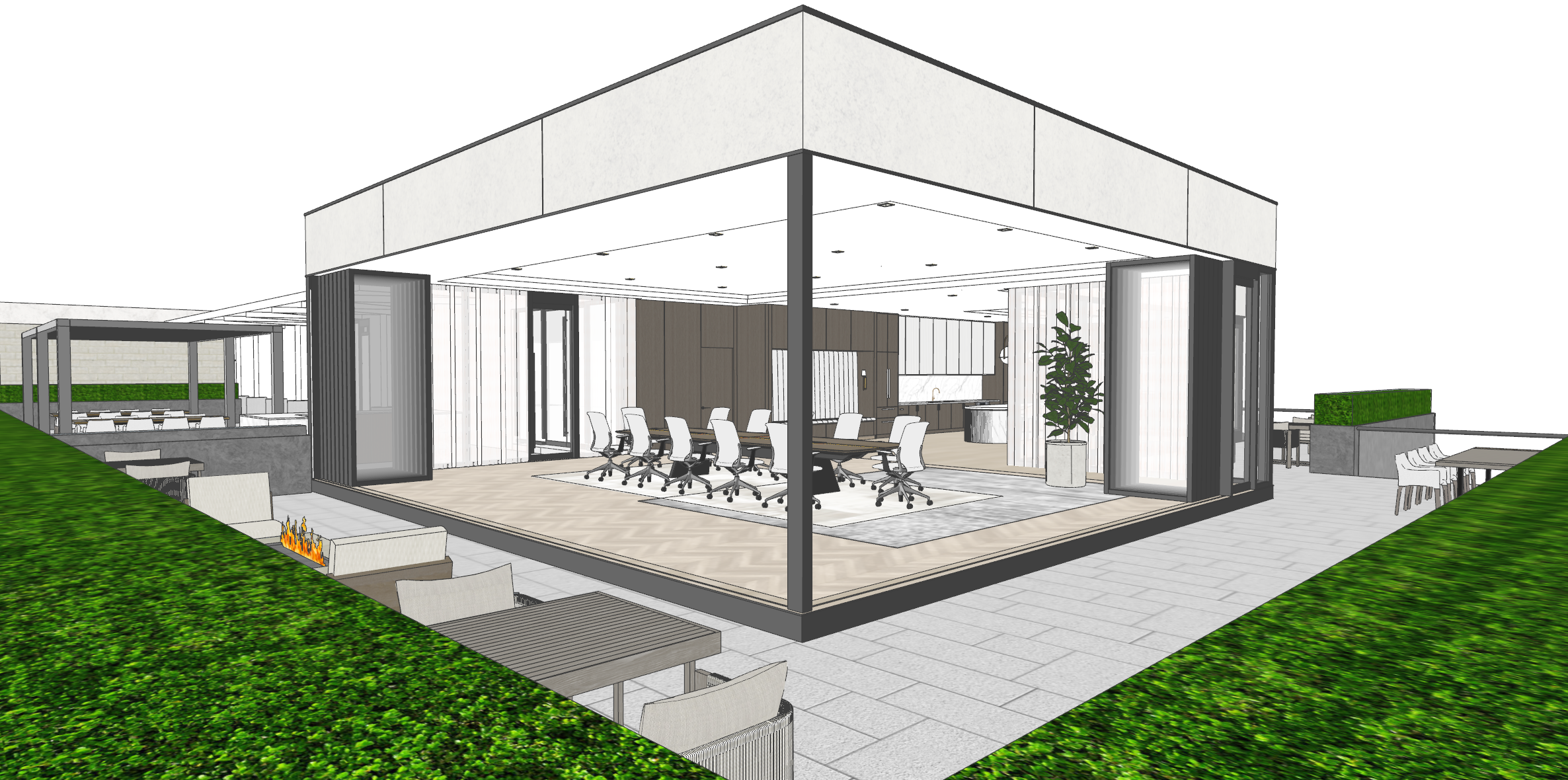 render a luxurious rooftop penthouse with warm natural sunlight the interior should be fully illuminated with artificial lighting including elegant cove lighting integrated within recessed tray ceilings to enhance depth and ambiance use high end contemporary materials and furnishings throughout add a few upscale business people with realistic detailed faces dressed in modern professional attire casually lounging and interacting with each other to convey a lively yet refined social atmosphere the lighting should be balanced between the warm late afternoon daylight and interior illumination creating a sophisticated photorealistic scene that highlights the luxury and openness of the penthouse setting all interior lights should be turned on and full lit