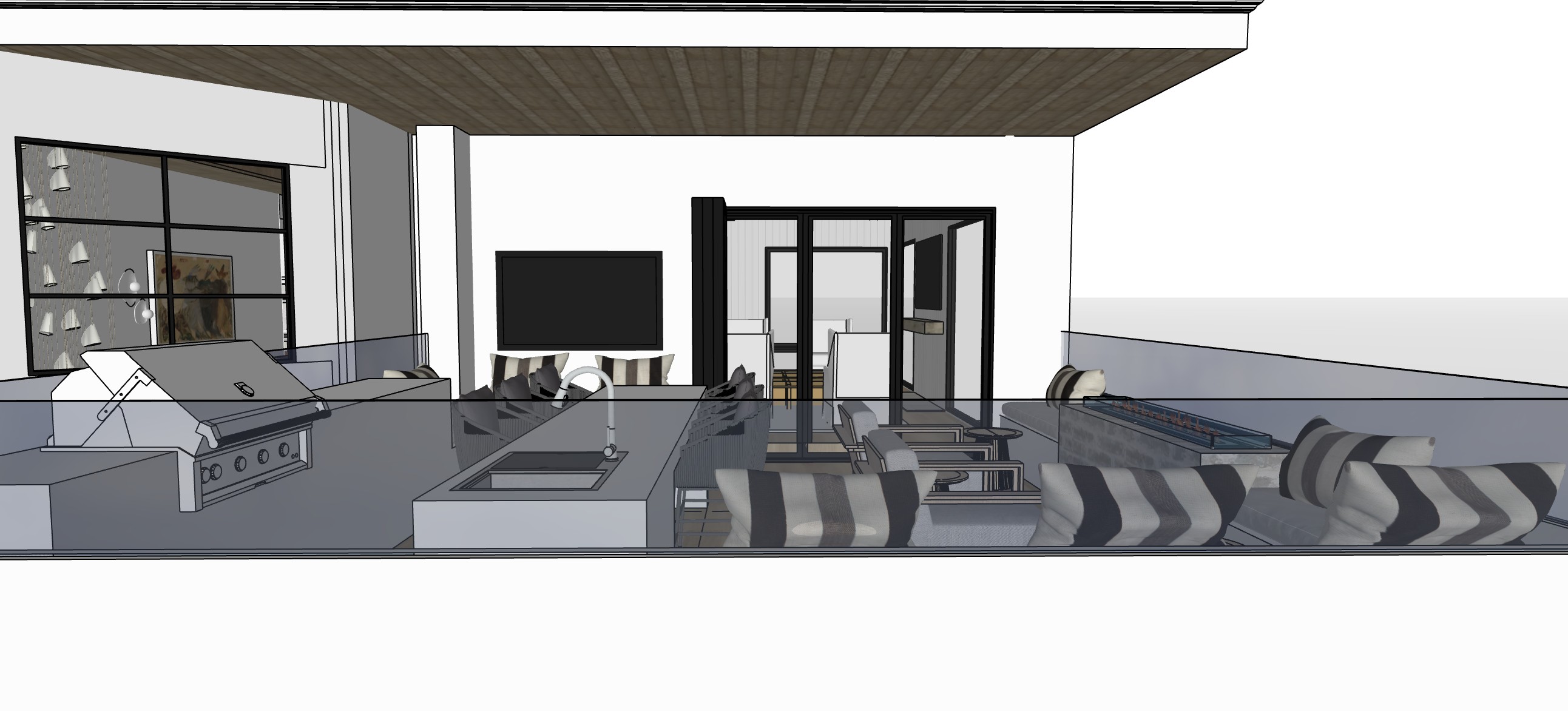 outdoor patio on second story add light grey cedar shake exterior finish flat roon add reflection to bifold doors afternoon lighting with ocean front landscaping and trees light concrete bbq surround black rectangle on wall is a tv exterior ceiling is all oak finish keep cedar shake on all exterior walls around windows and pillar