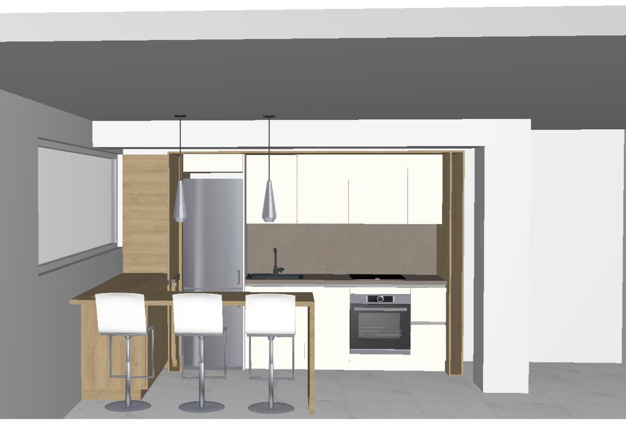 render a modern kitchen interior with a minimalist design use soft muted grey for the ceiling and walls the cabinetry is to be finished in a light oak wood color adding warmth and texture create an elegant atmosphere with stark white countertops and bar stools use a matte finish for the light grey back wall enhancing the contemporary style the flooring should feature a polished marble pattern in gentle beige tones contributing to a sophisticated and airy atmosphere ensure ample natural light creating a bright and inviting ambiance