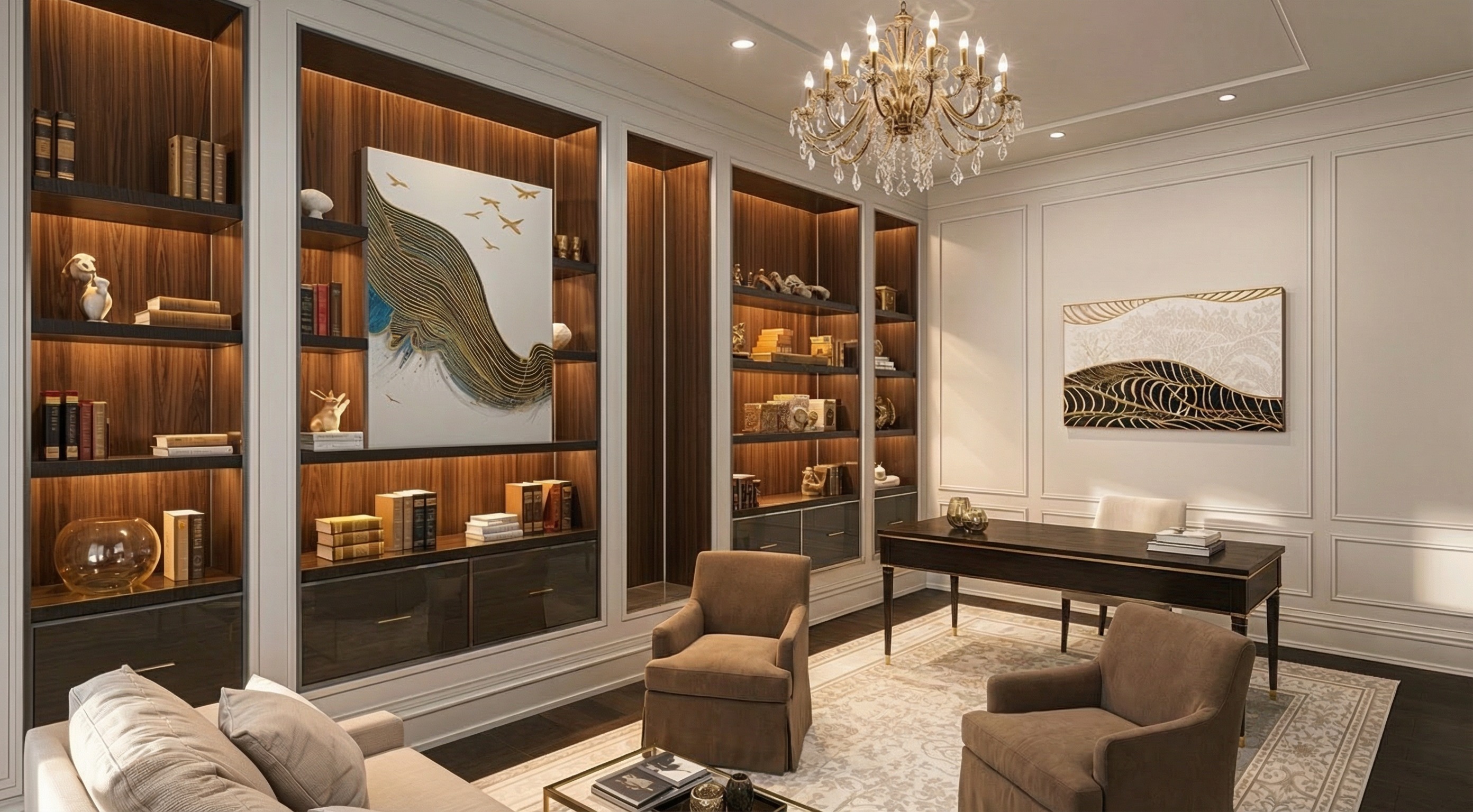 place the desk facing the right side of the room and add two chairs in front do not alter any other furniture or objects do not change materials textures lighting shadows reflections architecture floor patterns walls or ceilings no redesign no stylistic changes no enhancement the goal is exact duplication controlled color change and correct perspective only