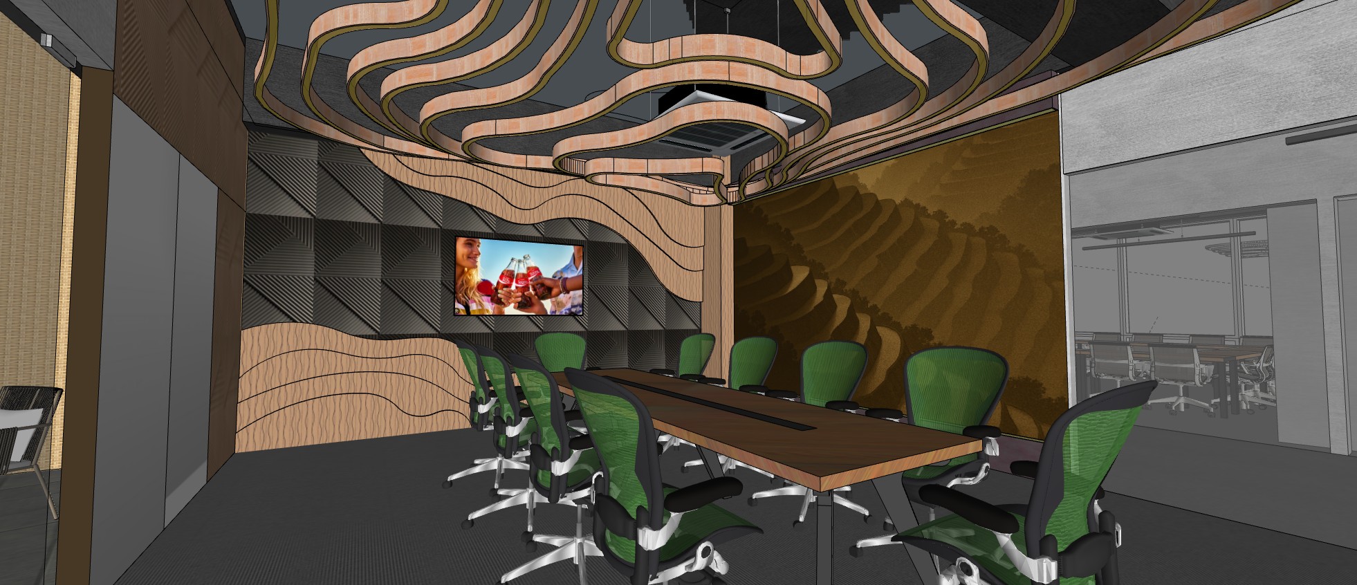 render a modern conference room with an elegant wavy wooden ceiling design chandelier use earthy tones and soft ambient lighting for a warm atmosphere the room features a long wooden table surrounded by green ergonomic chairs with black and silver accents on the wall display a geometric pattern with subtle texture in dark charcoal and natural wood colors include a screen displaying an engaging image the overall vibe is contemporary yet inviting with a touch of sophistication the floor is dark gray carpet on the left wall are two glass writing board panels
