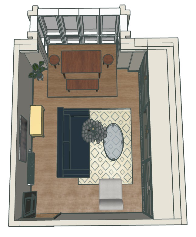 convert this floor plan into a realistic isometric 3d view of a living room show the space from an elevated angle with furniture walls and details visible use the same furniture as shows on the plan do not change the orientation of the floorplan