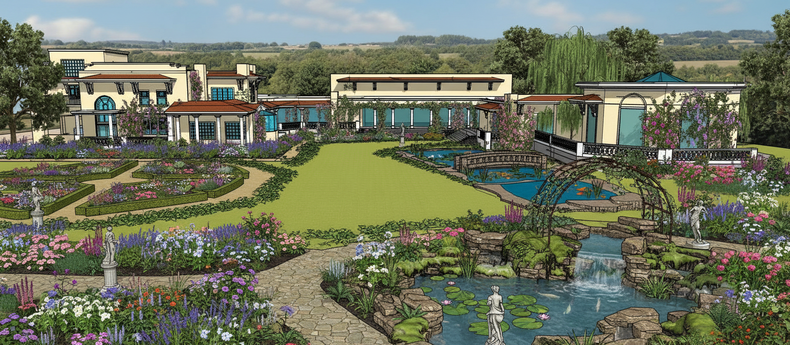 an elglish garden as shown only minimum flowers maximum grass