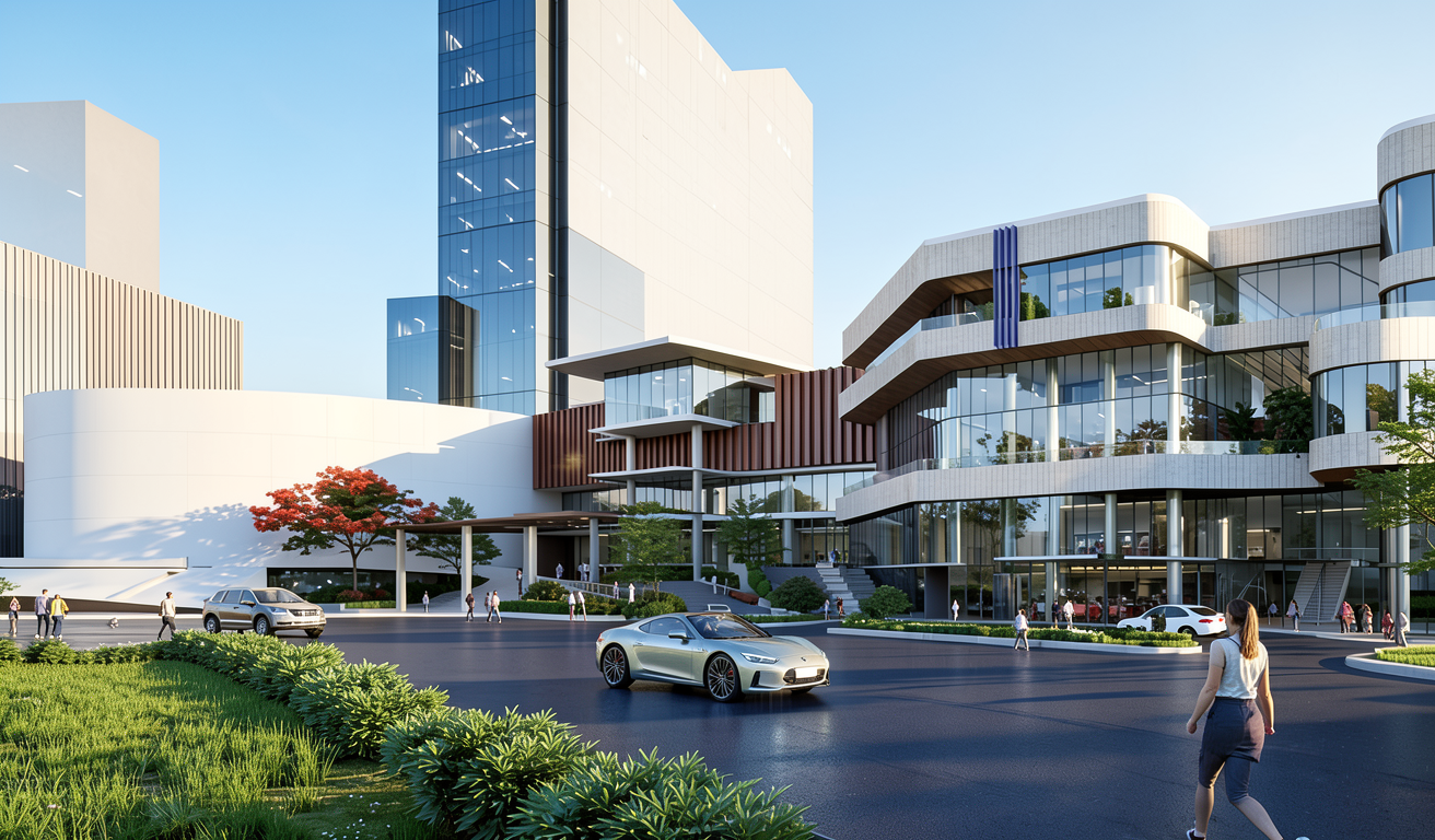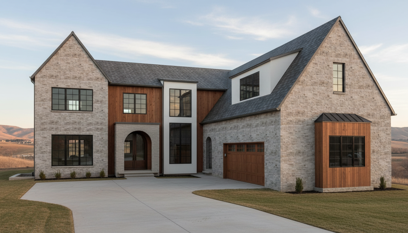 bed has a gold metal frame around the blue fabric the nightstands are a dark brown wood the dresser on the right is black the floor is a off white carpet the lamp shades are pleated add brightness to the ceiling light and the wall sconces the curtains are a cognac color the rug is a light rust orange modern pattern the bench at the end of the bed is bamboo with a woven seat the wall sconces are an antique brass and the crown and trim work is white the top portion of the wall is a neutral grasscloth wallpaper and the bottom part is a paint color that matches the wallpaper the ceiling fan is brass with walnut color wood blades
