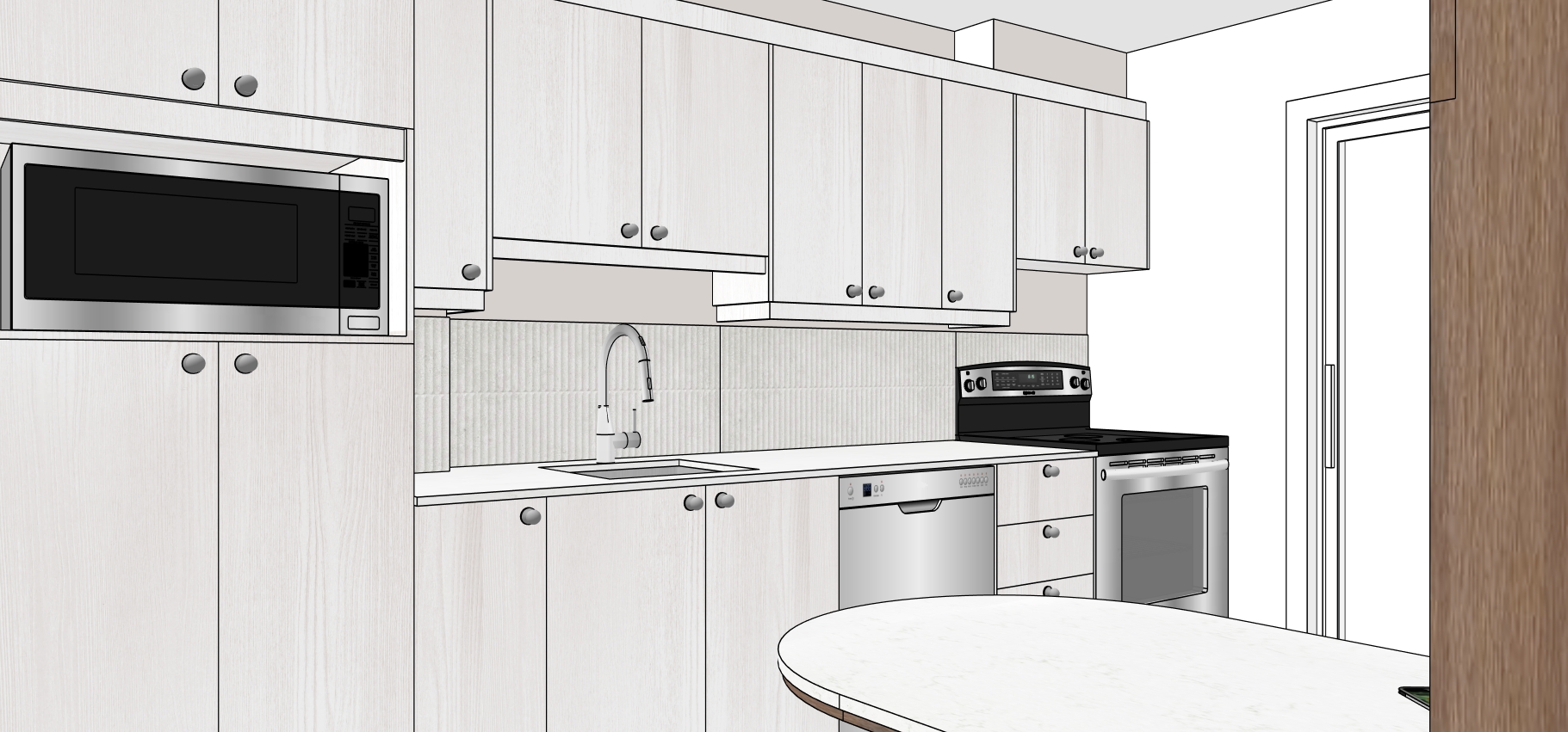 could you create a photorealistic rendering of an apartment kitchen the original cabinets are white with a light white wood texure all the countertop are vicostone polaris quartz the backsplash is new a large 40 cm x 120 cm 16 in x 48 in textured tile from centura s integra collection in pearl the darker cabinets are new they are tafisa melamine color l592 the appliances faucet and sink are stainless steel the cabinet door handles are brushed dark gray the wall color and the paint around the patio door are a light greige the background should be a view of a private outdoor courtyard with lots of trees and greenery we shouldn t focus on the background as it might be blurry