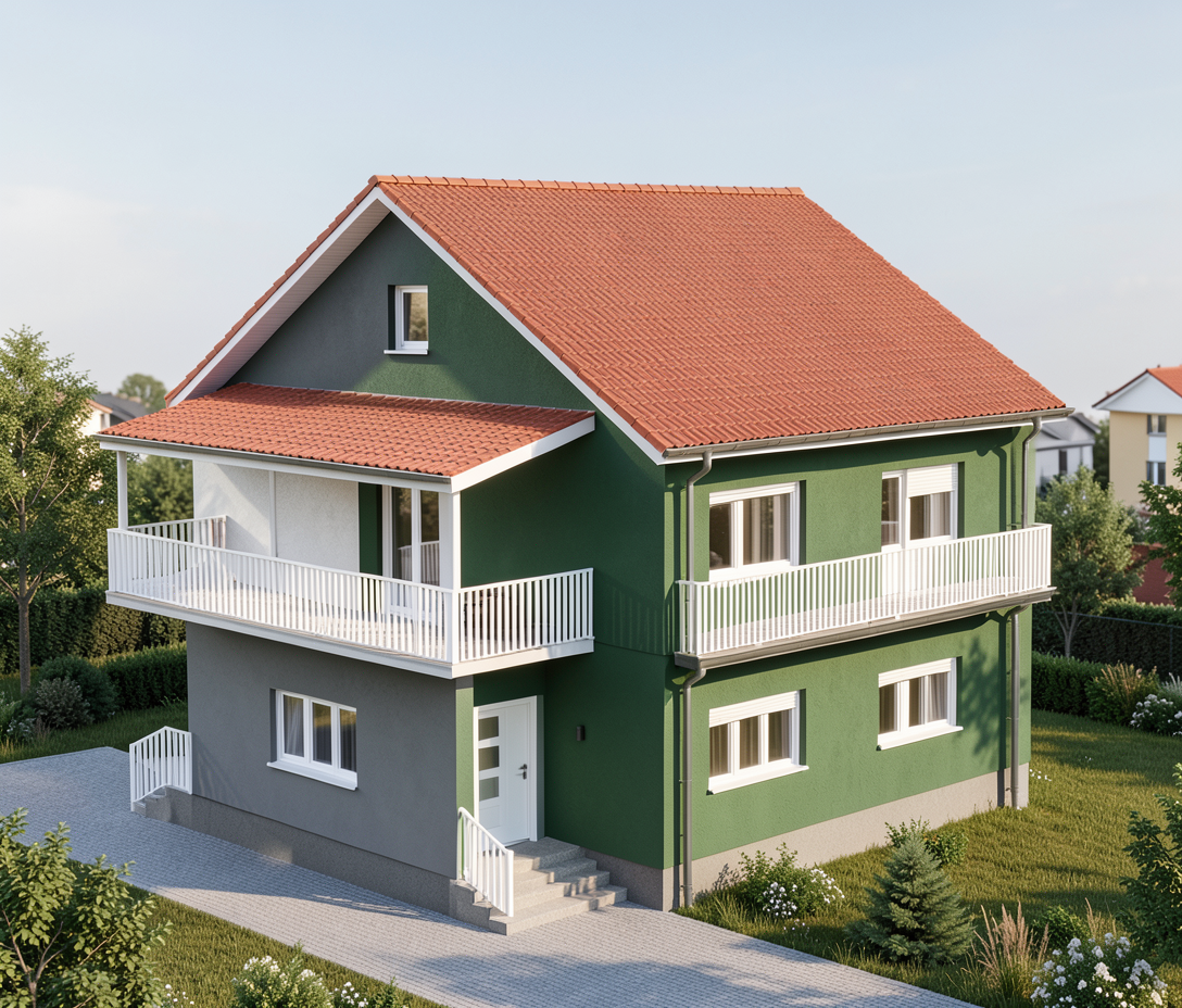 photorealistic architectural render of a modern european family house anthracite roof tiles recessed grey facade section main facade in green tones white window frames white wooden stair and balcony railing clean modern design high realism natural lighting soft shadows ultra detailed textures professional architectural visualization