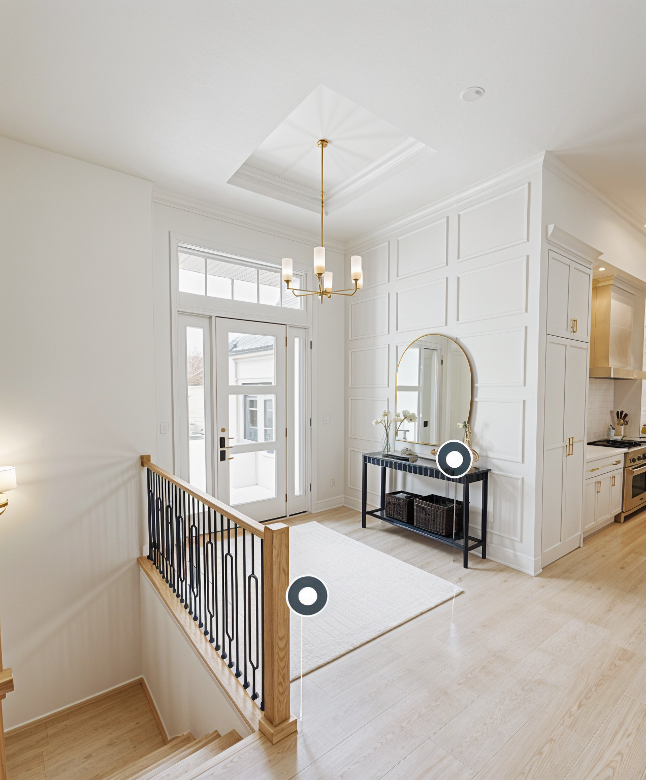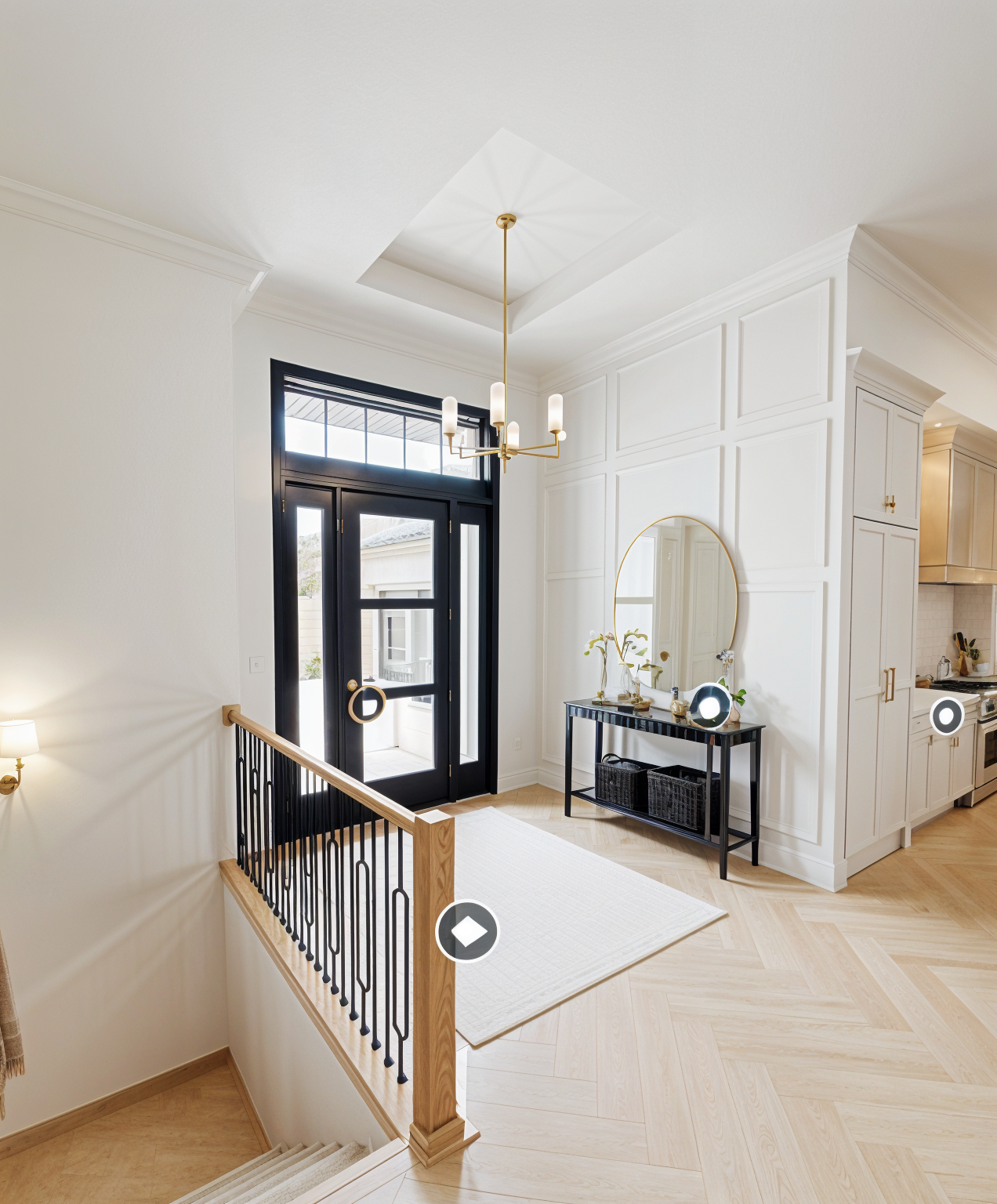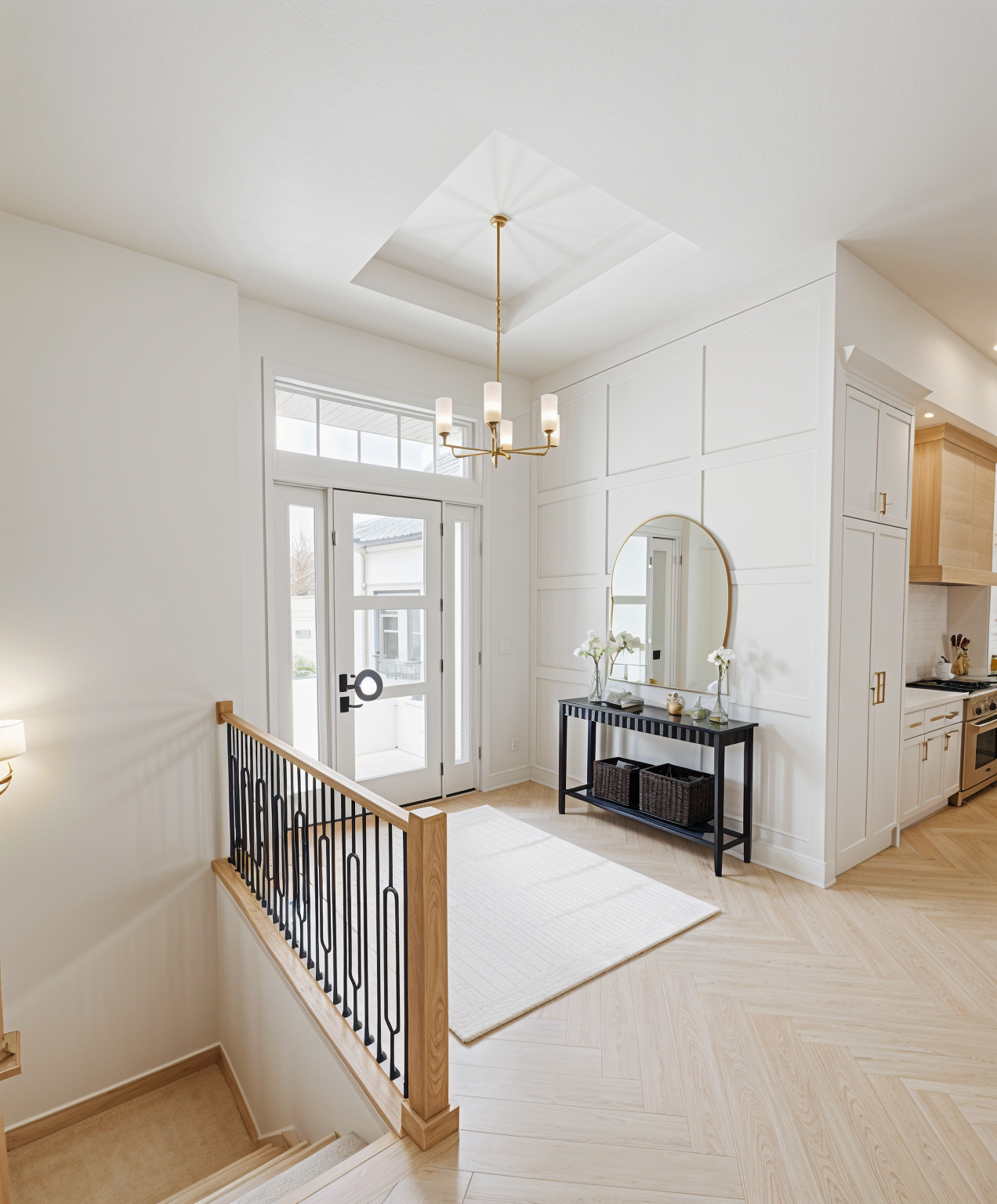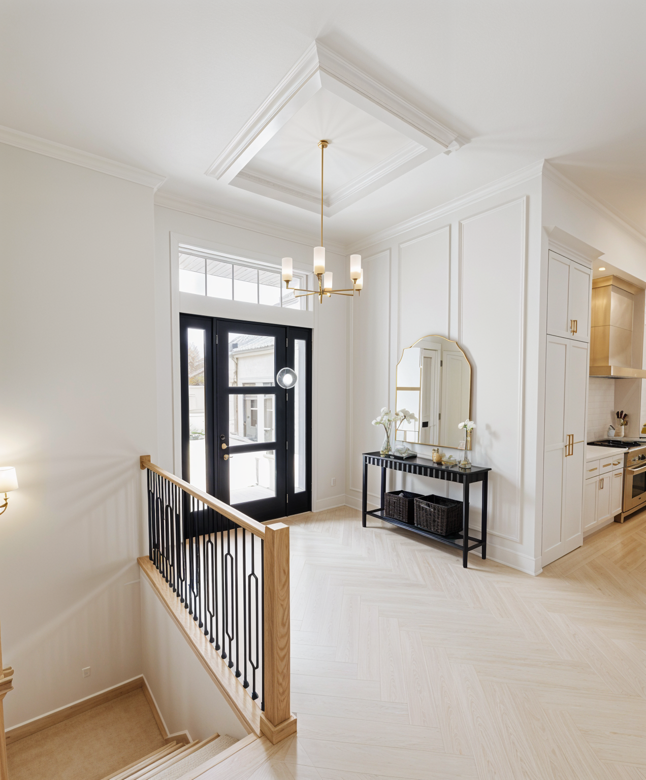 this is a foyer add picture frame molding on accent wall decorate foyer table better change floor to medium tone european white oak herringbone floors change door and windows to black with white wood trim add crown to tray ceiling