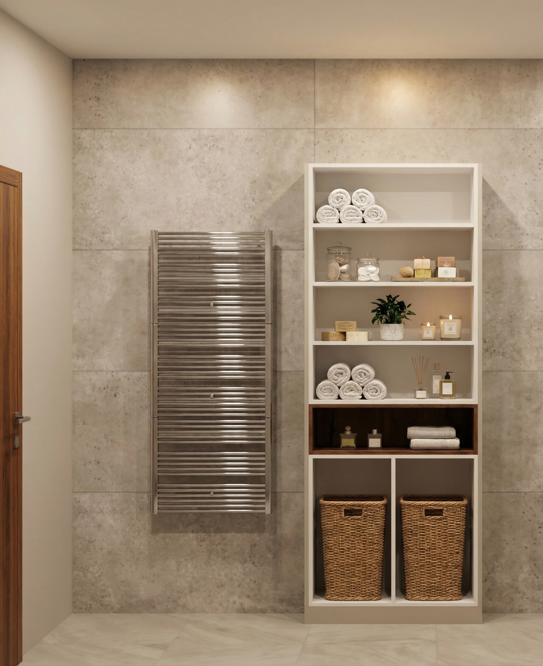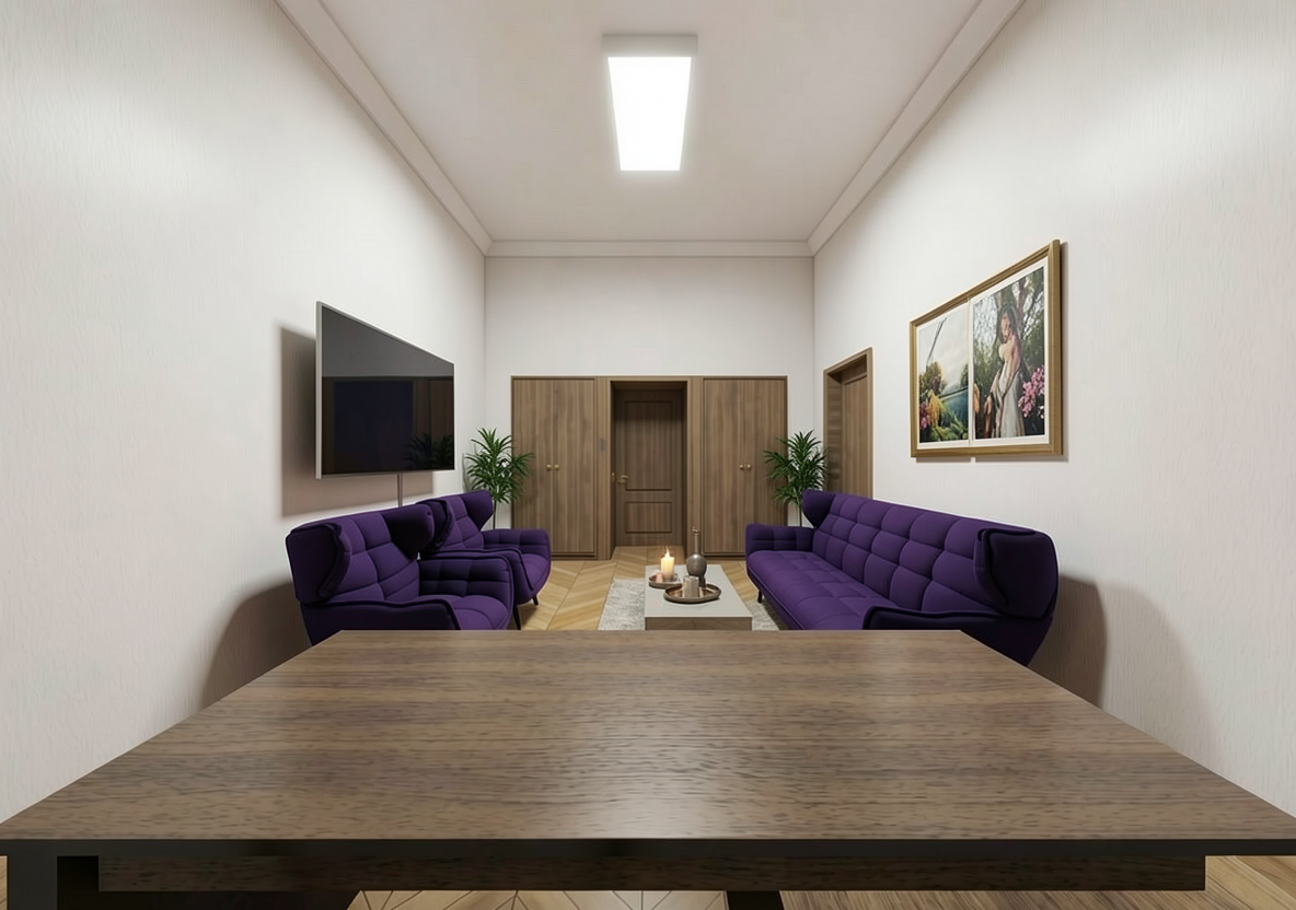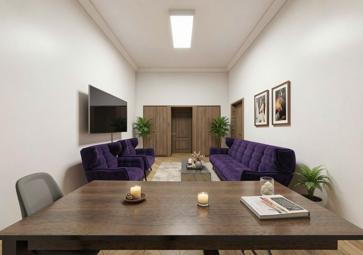 virtually enhance the provided interior render critical hard constraints this is not a redesign or restyling task this is a strict enhancement of an already defined scene you are only allowed to recolor the sofa and lounge chairs to a rich deep purple subtly enhance realism lighting balance shadows textures add minimal decor only where appropriate without altering the scene identity absolute prohibitions do not change any geometry do not alter shapes proportions silhouettes or structure of any furniture do not move objects or change layout or camera perspective do not remove replace or ignore any existing elements do not introduce new furniture that is not visible in the input do not redesign or reinterpret decor elements critical preservation rules all objects already present in the input must remain present this includes wall art pictures plants cushions rug coffee table objects do not remove or simplify any of these elements wall art important preserve the original wall art style composition and tone wall art must remain minimalistic soft and subtle as in the input do not replace with different styles high contrast or unrelated imagery do not change framing proportions or visual character of the artwork cushions critical maintain existing cushions on sofa and chairs do not remove them do not reduce their number do not flatten or simplify them ensure cushions remain visible and properly placed after recoloring upholstery change only allowed modification recolor only sofa rich deep purple lounge chairs rich deep purple preserve original material texture folds seams and geometry office chair preserve only if present in the input image do not introduce an office chair if not visible rug preserve existing rug must remain soft neutral and without pattern do not replace with patterned or persian rugs lighting very important preserve original lighting mood and atmosphere maintain soft diffused natural lighting avoid harsh contrast overexposure or overly sharp shadows do not make the scene look dramatically brighter colder or more clinical keep a warm balanced scandinavian interior ambiance plants preserve all existing plants maintain their placement and appearance do not remove or replace them coffee table decor preserve existing objects optionally enhance realism slightly no major additions desk surface keep as is with minimal natural accessories if visible spatial layout desk in foreground bottom third lounge chairs on the left mid ground sofa on the right mid ground tv and closets in background do not alter this composition important this is a preservation first task existing visual identity must remain intact enhancement must not override or reinterpret original design decisions final result the same scene same composition same objects with sofa and lounge chairs recolored to deep purple original cushions preserved and visible original minimalistic wall art preserved style unchanged plants preserved soft natural lighting maintained no harsh atmosphere no new furniture or reinterpretation of decor