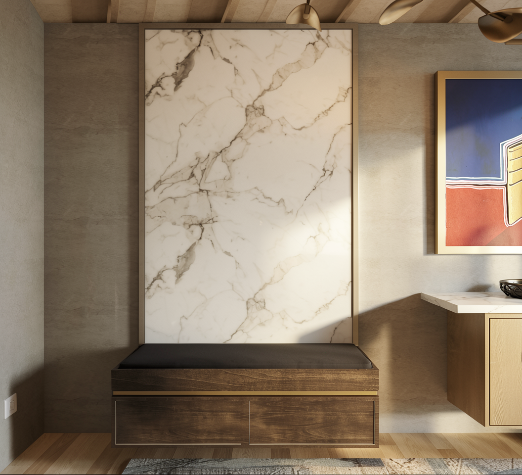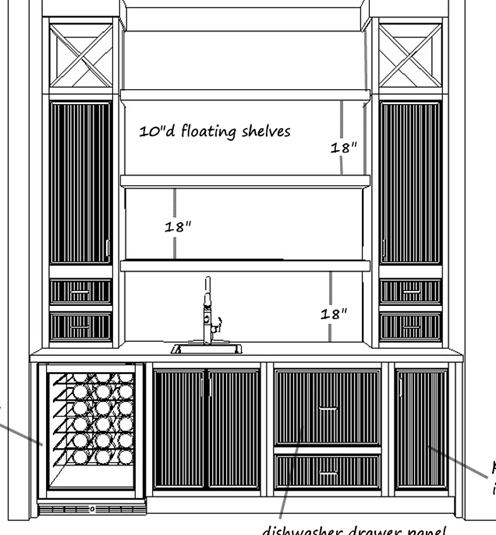 use a black marblecounter top and full height wall backsplash cabinets and open shelves are gray blue stained oak with reeded panel insets