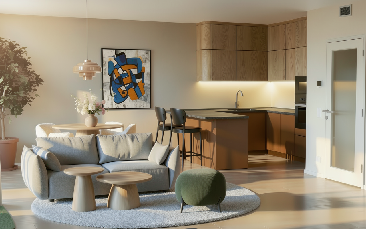 exterior shot can you add the painting from the second image to the middle wall of the 3d model from the first image as if it were wallpaper keep the geometry and the totally space the same as it is